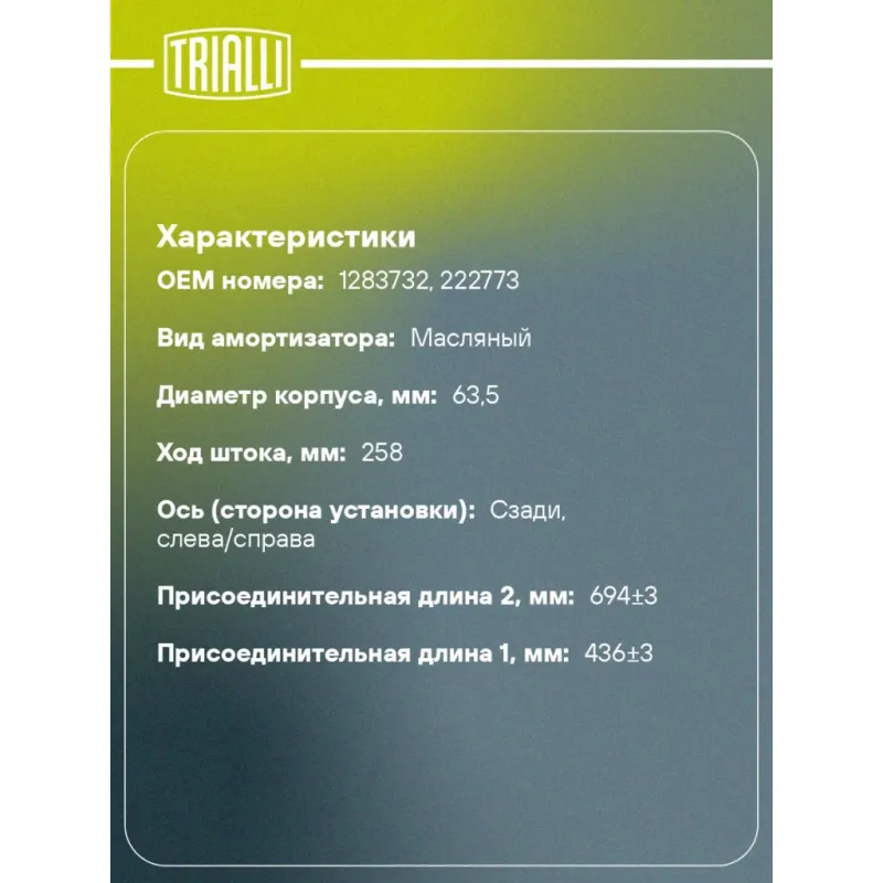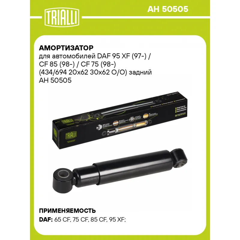 Амортизатор для автомобилей DAF 95 XF (97-) / CF 85 (98-) / CF 75 (98-) (434/694 20x62 30x62 O/O) задний Описание: Амортизатор AH 50505 бренда TRIALLI – это устройство для гашения колебаний (демпфирования) и поглощения толчков и ударов, действующих на раму. Особенности AH 50505: - Вид – Масляный; - Тип – Двухтрубный, гидравлический; Для крепления к деталям кузова или подвески используются крепления: верхнее Проушина/сайлентблок ; и нижнее Проушина/сайлентблок. Совместим с: DAF CF 75, CF 85, 95, XF 95, CF 65.Подбор по VIN-номеру вашего автомобиля - через кнопку 'Задать вопрос'. Специалист проверит применяемость и ответит вам. Преимущества: - Инновационная технология производства; - Контроль качества каждой позиции по чертежам и с помощью 3D модели; - Сальник NOK; - Высокоэффективная система проектирования; - Гарантия до двух лет или 60 000 км пробега; Амортизаторы автомобильные существенно влияют на комфорт вождения, сокращая вибрации от неровностей дороги, что делает поездку более плавной и приятной. Регулярное и своевременное обслуживание амортизаторов помогут продлить их срок службы и обеспечить надёжную работу. Характеристики: Артикул: AH 50505 OEM номера: 1283732, 222773 Товарная линейка: BLACK Количество на автомобиль: 2 Вид амортизатора: Масляный Тип верхнего крепления: Проушина/сайлентблок Тип нижнего крепления: Проушина/сайлентблок Диаметр корпуса, мм: 63.5 Диаметр штока, мм: 20 Ход штока, мм: 258 Тип амортизатора: Двухтрубный, гидравлический Ось (сторона установки): Сзади, слева/справа Присоединительная длина 2, мм: 694±3 Присоединительная длина 1, мм: 436±3 Сопутствующий товар: Амортизаторы: AH 50508 Гарантийный срок: 2 года/60 000 км Подходит для авто: DAF 65 CF (98-), 75 CF (95-), 85 CF (95-), 95 XF (97-) Для проверки применяемости отправьте VIN автомобиля через вкладку "Есть вопросы о товаре?" Комплектация: Амортизатор задний - 1 шт Шарнир резинометаллический - 2 шт Гарантия: от 1 года.