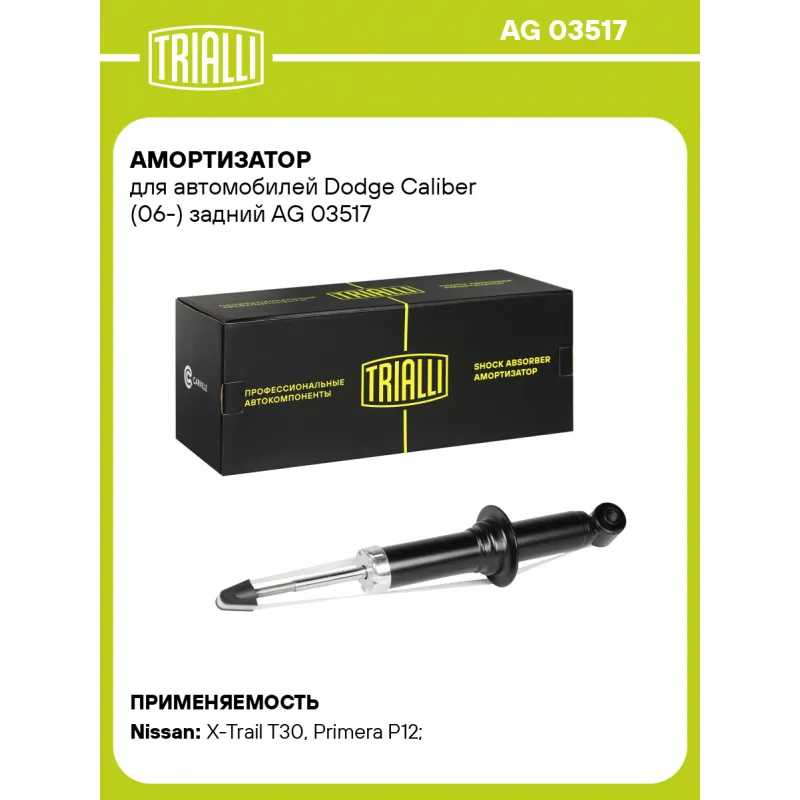 Амортизатор для автомобилей Dodge Caliber (06-) задний Описание: Амортизатор AG 03517 бренда TRIALLI – это устройство для гашения колебаний (демпфирования) и поглощения толчков и ударов, действующих на раму. Особенности AG 03517: - Вид – Масляный с газовым подпором низкого давления; - Тип – Двухтрубный, гидравлический; Для крепления к деталям кузова или подвески используются крепления: верхнее Шток M10x1.25; и нижнее Проушина/сайлентблок. Совместим с: DODGE CALIBER, NISSAN PRIMERA, X-TRAIL.Подбор по VIN-номеру вашего автомобиля - через кнопку 'Задать вопрос'. Специалист проверит применяемость и ответит вам. Преимущества: - Инновационная технология производства; - Контроль качества каждой позиции по чертежам и с помощью 3D модели; - Сальник NOK; - Высокоэффективная система проектирования; - Гарантия до двух лет или 60 000 км пробега; Амортизаторы автомобильные существенно влияют на комфорт вождения, сокращая вибрации от неровностей дороги, что делает поездку более плавной и приятной. Регулярное и своевременное обслуживание амортизаторов помогут продлить их срок службы и обеспечить надёжную работу. Характеристики: Артикул: AG 03517 OEM номера: 5105106AD, 5105106AE, 5105106AF, 5105106AG Товарная линейка: BLACK Количество на автомобиль: 2 Вид амортизатора: Масляный с газовым подпором низкого давления Тип верхнего крепления: Шток Тип нижнего крепления: Проушина/сайлентблок Диаметр корпуса, мм: 45 Диаметр штока, мм: 12.5 Ход штока, мм: 167 Размер резьбы штока: M10x1.25 Тип амортизатора: Двухтрубный, гидравлический Ось (сторона установки): Сзади, слева/справа Присоединительная длина 2, мм: 483 Присоединительная длина 1, мм: 316 Сопутствующий товар: Амортизаторы: AG 03151; AG 03352 Гарантийный срок: 2 года/60 000 км Подходит для авто: Nissan X-Trail T30 (01-), Primera P12 (02-), X-Trail T30 (01-), Primera P12 (02-) Для проверки применяемости отправьте VIN автомобиля через вкладку "Есть вопросы о товаре?" Комплектация: Амортизатор задний - 1 шт Шарнир резинометаллический - 1 шт Гайка крепежная - 1 шт Гарантия: от 1 года.