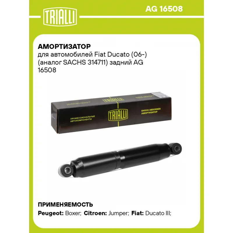 Амортизатор для автомобилей Fiat Ducato (06-) (аналог SACHS 314711) задний Описание: Амортизатор AG 16508 бренда TRIALLI – это устройство для гашения колебаний (демпфирования) и поглощения толчков и ударов, действующих на раму. Особенности AG 16508: - Вид – Масляный с газовым подпором низкого давления; - Тип – Двухтрубный, гидравлический; Для крепления к деталям кузова или подвески используются крепления: верхнее Проушина/сайлентблок ; и нижнее Проушина/сайлентблок. Совместим с: CITROEN JUMPER, FIAT DUCATO, PEUGEOT BOXER.Подбор по VIN-номеру вашего автомобиля - через кнопку 'Задать вопрос'. Специалист проверит применяемость и ответит вам. Преимущества: - Инновационная технология производства; - Контроль качества каждой позиции по чертежам и с помощью 3D модели; - Сальник NOK; - Высокоэффективная система проектирования; - Гарантия до двух лет или 60 000 км пробега; Амортизаторы автомобильные существенно влияют на комфорт вождения, сокращая вибрации от неровностей дороги, что делает поездку более плавной и приятной. Регулярное и своевременное обслуживание амортизаторов помогут продлить их срок службы и обеспечить надёжную работу. Характеристики: Артикул: AG 16508 OEM номера: 1355825080, 1355831080, 1357468080, 1359217080, 1362550080, 1362552080, 1362559080, 1362880080, 5206 KP, 5206 KT, 5206 TV, 5206 TZ, 5206 KQ, 5206 KV, 1357470080, 1359219080, 1362561080 Товарная линейка: BLACK Количество на автомобиль: 2 Вид амортизатора: Масляный с газовым подпором низкого давления Тип верхнего крепления: Проушина/сайлентблок Тип нижнего крепления: Проушина/сайлентблок Диаметр корпуса, мм: 58 Диаметр штока, мм: 16 Ход штока, мм: 139 Тип амортизатора: Двухтрубный, гидравлический Ось (сторона установки): Сзади, слева/справа Дополнительная информация: Подбирать амортизатор по VIN автомобиля согласно привязанным ОЕМ номерам к данному амортизатору Присоединительная длина 2, мм: 418 Присоединительная длина 1, мм: 279 Сопутствующий товар: Амортизаторы: AG 16052; AG 16053; AG 16509; AG 16510 Гарантийный срок: 2 года/60 000 км Подходит для авто: Peugeot Boxer (06-), Boxer (06-) Citroen Jumper (06-), Jumper (06-) Fiat Ducato III (06-), Ducato III (06-) Для проверки применяемости отправьте VIN автомобиля через вкладку "Есть вопросы о товаре?" Комплектация: Амортизатор задний - 1 шт Шарнир резинометаллический - 2 шт Гарантия: от 1 года.