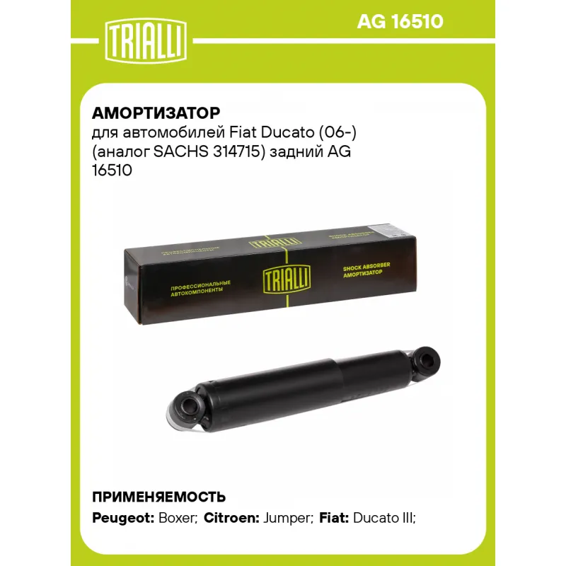 Амортизатор для автомобилей Fiat Ducato (06-) (аналог SACHS 314715) задний Описание: Амортизатор AG 16510 бренда TRIALLI – это устройство для гашения колебаний (демпфирования) и поглощения толчков и ударов, действующих на раму. Особенности AG 16510: - Вид – Масляный с газовым подпором низкого давления; - Тип – Двухтрубный, гидравлический; Для крепления к деталям кузова или подвески используются крепления: верхнее Проушина/сайлентблок ; и нижнее Проушина/сайлентблок. Совместим с: CITROEN JUMPER, FIAT DUCATO, OPEL MOVANO, PEUGEOT BOXER.Подбор по VIN-номеру вашего автомобиля - через кнопку 'Задать вопрос'. Специалист проверит применяемость и ответит вам. Преимущества: - Инновационная технология производства; - Контроль качества каждой позиции по чертежам и с помощью 3D модели; - Сальник NOK; - Высокоэффективная система проектирования; - Гарантия до двух лет или 60 000 км пробега; Амортизаторы автомобильные существенно влияют на комфорт вождения, сокращая вибрации от неровностей дороги, что делает поездку более плавной и приятной. Регулярное и своевременное обслуживание амортизаторов помогут продлить их срок службы и обеспечить надёжную работу. Характеристики: Артикул: AG 16510 OEM номера: 1352281080, 1355821080, 1355824080, 1355827080, 1355829080, 1355830080, 1356967080, 1362546080, 1362547080, 1362548080, 1362549080, 1362553080, 1362554080, 1362577080, 5206 JN, 5206 KK, 5206 KN, 5206 KZ, 5206 LA, 5206 LV, 5206 LW, 5206 NA, 5206 NZ, 5206 PA, 5206 PE, 5206 PF, 5206 PG, 5206 TR, 5206 TT, 5206 TX, 5206 TY, 5206 VC, 5206 VF, 5206 VG, 5206 VH, 5206 JL, 5206 KJ, 5206 KL, 5206 KR, 5206 LZ, 5206 PC, 1357401080, 1357467080, 1357468080, 1357469080, 1357601080, 1359216080, 1359217080, 1359218080, 1361278080, 1362555080, 1362558080, 1362559080, 1362560080 Товарная линейка: BLACK Количество на автомобиль: 2 Вид амортизатора: Масляный с газовым подпором низкого давления Тип верхнего крепления: Проушина/сайлентблок Тип нижнего крепления: Проушина/сайлентблок Диаметр корпуса, мм: 51 Диаметр штока, мм: 15 Ход штока, мм: 153 Тип амортизатора: Двухтрубный, гидравлический Ось (сторона установки): Сзади, слева/справа Дополнительная информация: Подбирать амортизатор по VIN автомобиля согласно привязанным ОЕМ номерам к данному амортизатору Присоединительная длина 2, мм: 439 Присоединительная длина 1, мм: 286 Сопутствующий товар: Амортизаторы: AG 16052; AG 16053; AG 16508; AG 16509 Гарантийный срок: 2 года/60 000 км Подходит для авто: Peugeot Boxer (06-), Boxer (06-) Citroen Jumper (06-), Jumper (06-) Fiat Ducato III (06-), Ducato III (06-) Для проверки применяемости отправьте VIN автомобиля через вкладку "Есть вопросы о товаре?" Комплектация: Амортизатор задний - 1 шт Шарнир резинометаллический - 2 шт Гарантия: от 1 года.