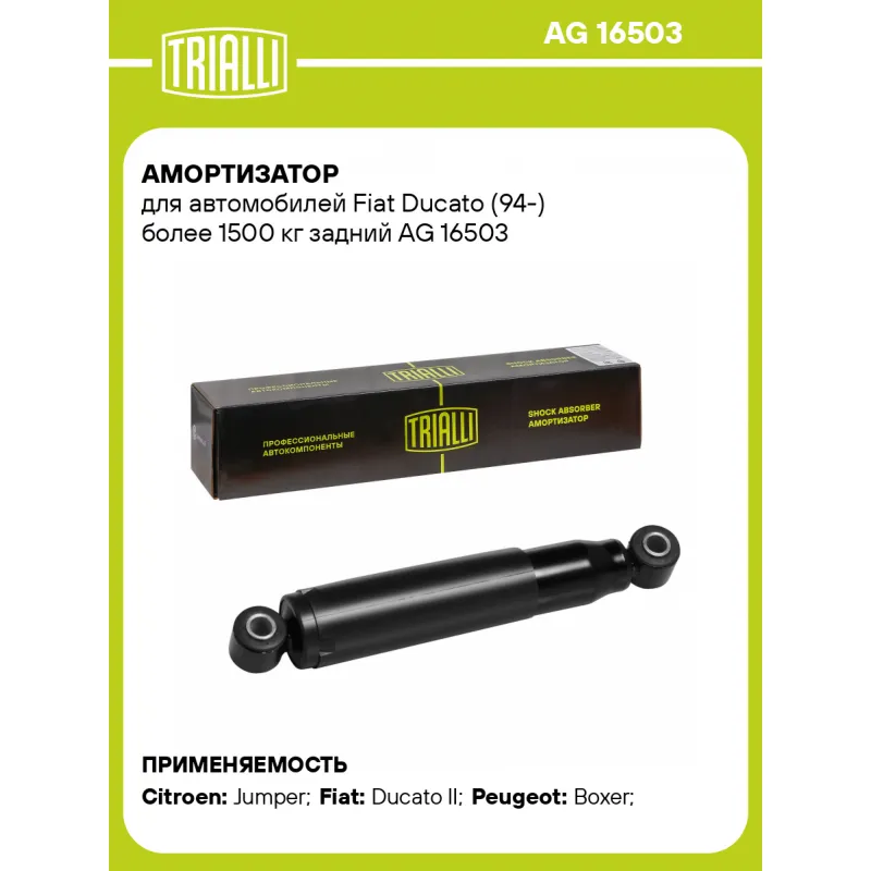 Амортизатор для автомобилей Fiat Ducato (94-) более 1500 кг задний Описание: Амортизатор AG 16503 бренда TRIALLI – это устройство для гашения колебаний (демпфирования) и поглощения толчков и ударов, действующих на раму. Особенности AG 16503: - Вид – Масляный; - Тип – Двухтрубный, гидравлический; Для крепления к деталям кузова или подвески используются крепления: верхнее Проушина/сайлентблок ; и нижнее Проушина/сайлентблок. Совместим с: CITROEN JUMPER, FIAT DUCATO, PEUGEOT BOXER.Подбор по VIN-номеру вашего автомобиля - через кнопку 'Задать вопрос'. Специалист проверит применяемость и ответит вам. Преимущества: - Инновационная технология производства; - Контроль качества каждой позиции по чертежам и с помощью 3D модели; - Сальник NOK; - Высокоэффективная система проектирования; - Гарантия до двух лет или 60 000 км пробега; Амортизаторы автомобильные существенно влияют на комфорт вождения, сокращая вибрации от неровностей дороги, что делает поездку более плавной и приятной. Регулярное и своевременное обслуживание амортизаторов помогут продлить их срок службы и обеспечить надёжную работу. Характеристики: Артикул: AG 16503 OEM номера: 1303682082, 1312314080, 1312333080, 1314943080, 1317684080, 1318258080, 1318259080, 1327746080, 1327748080, 5206A9, 5206C1, 5206C5, 5206P7, 5206P8, 5206P9, 5206Q0, 5206Q1, 5206WQ, 1303682080, 1317535080, 1318946080, 1318947080, 1329683080, 1329684080, 1346464080, 1347238080, 1351064080, 5206C3, 5206C4, 5206C0 Товарная линейка: BLACK Количество на автомобиль: 2 Вид амортизатора: Масляный Тип верхнего крепления: Проушина/сайлентблок Тип нижнего крепления: Проушина/сайлентблок Диаметр корпуса, мм: 50,8 Диаметр штока, мм: 14 Ход штока, мм: 168 Тип амортизатора: Двухтрубный, гидравлический Ось (сторона установки): Сзади, слева/справа Дополнительная информация: Для а/м грузоподъёмностью более 1500 кг Присоединительная длина 2, мм: 488 Присоединительная длина 1, мм: 320 Сопутствующий товар: Амортизаторы: AG 16501; AG 16502; AH 16050; AH 16051 Гарантийный срок: 2 года/60 000 км Подходит для авто: Citroen Jumper (94-), Jumper (94-) Fiat Ducato II (94-), Ducato II (94-) Peugeot Boxer (94-) Для проверки применяемости отправьте VIN автомобиля через вкладку "Есть вопросы о товаре?" Комплектация: Амортизатор задний - 1 шт Шарнир резинометаллический - 2 шт Гарантия: от 1 года.