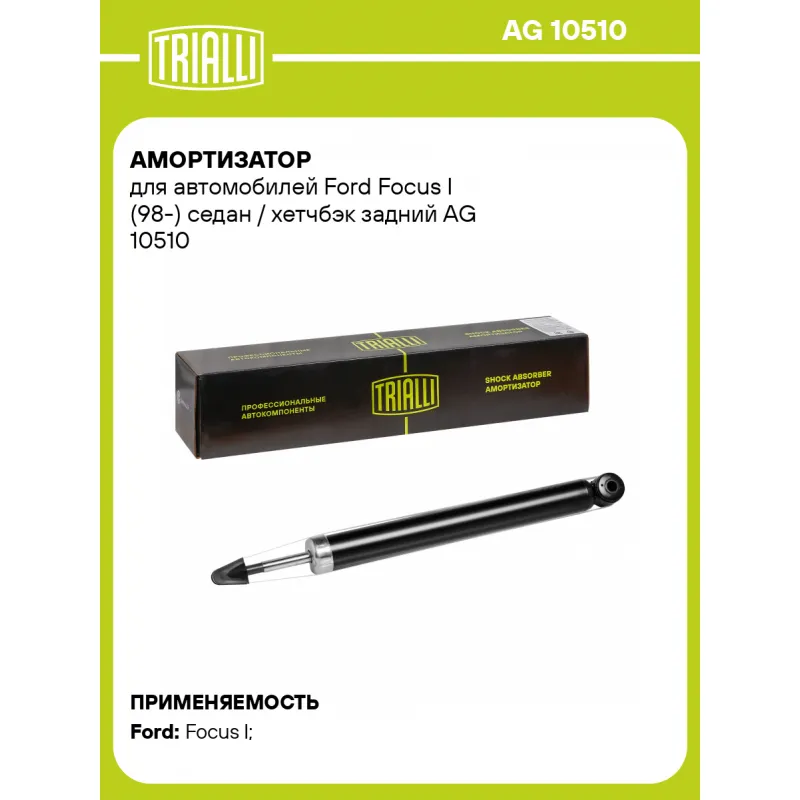 Амортизатор для автомобилей Ford Focus I (98-) седан / хетчбэк задний Описание: Амортизатор AG 10510 бренда TRIALLI – это устройство для гашения колебаний (демпфирования) и поглощения толчков и ударов, действующих на раму. Особенности AG 10510: - Вид – Масляный с газовым подпором низкого давления; - Тип – Двухтрубный, гидравлический; Для крепления к деталям кузова или подвески используются крепления: верхнее Шток M8x1.25; и нижнее Проушина/сайлентблок. Совместим с: FORD FOCUS.Подбор по VIN-номеру вашего автомобиля - через кнопку 'Задать вопрос'. Специалист проверит применяемость и ответит вам. Преимущества: - Инновационная технология производства; - Контроль качества каждой позиции по чертежам и с помощью 3D модели; - Сальник NOK; - Высокоэффективная система проектирования; - Гарантия до двух лет или 60 000 км пробега; Амортизаторы автомобильные существенно влияют на комфорт вождения, сокращая вибрации от неровностей дороги, что делает поездку более плавной и приятной. Регулярное и своевременное обслуживание амортизаторов помогут продлить их срок службы и обеспечить надёжную работу. Характеристики: Артикул: AG 10510 OEM номера: 1075585, 1077625, 1077626, 1077629, 1077630, 1078726, 1078731, 1079558, 1085913, 1087965, 1087966, 1093185, 1112119, 1126205, 1138667, 1142760, 1143683, 1201672, 1201680, 1201877, 1202657, 1216098, 1M5118008AA, 1M5118008BA, 1M5118008BB, 1M5118080AA, 1M5118080BA, 1M5O18080AE, 2M5V18080AA, 4327867, 4417789, 98AG18008JV, 98AG18080GR, 98AG18080GS, 98AG18080HS, 98AG18080HT, 98AG18080HU, 98AG18080HV, 98AG18080JR, 98AG18080JS, 98AG18080JT, 98AG18080JV, 98AG18080LN, 98AG18080MR, 98AG18080MS, 98AG18080RB, 98AX18080HU, 98AX18080JT Товарная линейка: BLACK Количество на автомобиль: 2 Вид амортизатора: Масляный с газовым подпором низкого давления Тип верхнего крепления: Шток Тип нижнего крепления: Проушина/сайлентблок Диаметр корпуса, мм: 38 Диаметр штока, мм: 12,5 Ход штока, мм: 210 Размер резьбы штока: M8x1.25 Тип амортизатора: Двухтрубный, гидравлический Ось (сторона установки): Сзади, слева/справа Дополнительная информация: Упаковка изделия может отличаться от представленной на фото Присоединительная длина 2, мм: 638 Присоединительная длина 1, мм: 428 Сопутствующий товар: Ремонтные комплекты амортизаторов: BCS 10102 Сопутствующий товар: Амортизаторы: AG 10167; AG 10368 Гарантийный срок: 2 года/60 000 км Подходит для авто: Ford Focus I (98-) Для проверки применяемости отправьте VIN автомобиля через вкладку "Есть вопросы о товаре?" Комплектация: Амортизатор задний - 1 шт Шарнир резинометаллический - 1 шт Гайка крепежная - 1 шт Гарантия: от 1 года.