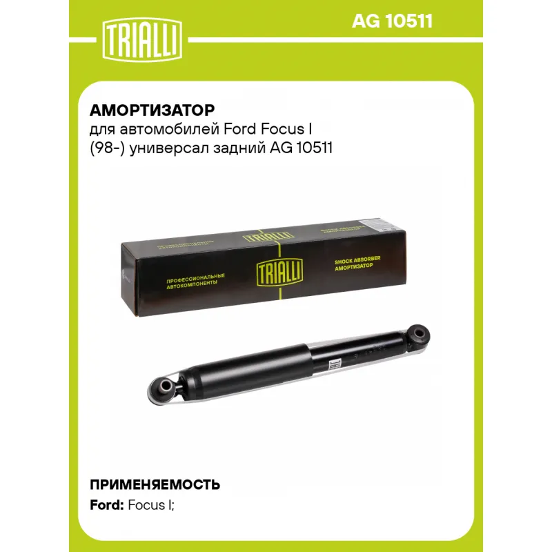 Амортизатор для автомобилей Ford Focus I (98-) универсал задний Описание: Амортизатор AG 10511 бренда TRIALLI – это устройство для гашения колебаний (демпфирования) и поглощения толчков и ударов, действующих на раму. Особенности AG 10511: - Вид – Масляный с газовым подпором низкого давления; - Тип – Двухтрубный, гидравлический; Для крепления к деталям кузова или подвески используются крепления: верхнее Проушина/сайлентблок ; и нижнее Проушина/сайлентблок. Совместим с: FORD FOCUS.Подбор по VIN-номеру вашего автомобиля - через кнопку 'Задать вопрос'. Специалист проверит применяемость и ответит вам. Преимущества: - Инновационная технология производства; - Контроль качества каждой позиции по чертежам и с помощью 3D модели; - Сальник NOK; - Высокоэффективная система проектирования; - Гарантия до двух лет или 60 000 км пробега; Амортизаторы автомобильные существенно влияют на комфорт вождения, сокращая вибрации от неровностей дороги, что делает поездку более плавной и приятной. Регулярное и своевременное обслуживание амортизаторов помогут продлить их срок службы и обеспечить надёжную работу. Характеристики: Артикул: AG 10511 OEM номера: 1085814, 1085815, 1087963, 1087964, 1107059, 1111008, 1150027, 1152585, 1201812, 1201838, 98AG18008AJ, 98AG18008CK, 98AG18080AH, 98AG18080AJ, 98AG18080CH, 98AG18080CJ, 98AG18080CK, 98AX18080AH, 98AX18080CH Товарная линейка: BLACK Количество на автомобиль: 2 Вид амортизатора: Масляный с газовым подпором низкого давления Тип верхнего крепления: Проушина/сайлентблок Тип нижнего крепления: Проушина/сайлентблок Диаметр корпуса, мм: 38 Диаметр штока, мм: 12,5 Ход штока, мм: 138 Тип амортизатора: Двухтрубный, гидравлический Ось (сторона установки): Сзади, слева/справа Дополнительная информация: Упаковка изделия может отличаться от представленной на фото Присоединительная длина 2, мм: 461 Присоединительная длина 1, мм: 323 Сопутствующий товар: Амортизаторы: AG 10167; AG 10368 Гарантийный срок: 2 года/60 000 км Подходит для авто: Ford Focus I (98-) Для проверки применяемости отправьте VIN автомобиля через вкладку "Есть вопросы о товаре?" Комплектация: Амортизатор задний - 1 шт Шарнир резинометаллический - 2 шт Гарантия: от 1 года.