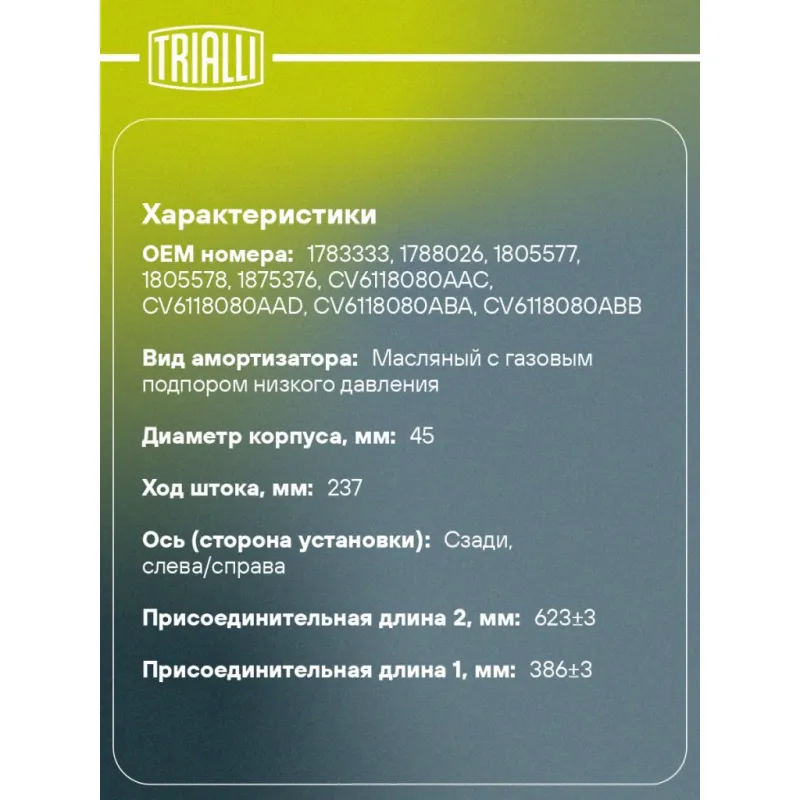 Амортизатор для автомобилей Ford Kuga (12-) задний Описание: Амортизатор AG 10517 бренда TRIALLI – это устройство для гашения колебаний (демпфирования) и поглощения толчков и ударов, действующих на раму. Особенности AG 10517: - Вид – Масляный с газовым подпором низкого давления; - Тип – Двухтрубный, гидравлический; Для крепления к деталям кузова или подвески используются крепления: верхнее Шток M8x1.25; и нижнее Проушина/сайлентблок. Совместим с: FORD KUGA.Подбор по VIN-номеру вашего автомобиля - через кнопку 'Задать вопрос'. Специалист проверит применяемость и ответит вам. Преимущества: - Инновационная технология производства; - Контроль качества каждой позиции по чертежам и с помощью 3D модели; - Сальник NOK; - Высокоэффективная система проектирования; - Гарантия до двух лет или 60 000 км пробега; Амортизаторы автомобильные существенно влияют на комфорт вождения, сокращая вибрации от неровностей дороги, что делает поездку более плавной и приятной. Регулярное и своевременное обслуживание амортизаторов помогут продлить их срок службы и обеспечить надёжную работу. Характеристики: Артикул: AG 10517 OEM номера: 1783333, 1788026, 1805577, 1805578, 1875376, CV6118080AAC, CV6118080AAD, CV6118080ABA, CV6118080ABB Товарная линейка: BLACK Количество на автомобиль: 2 Вид амортизатора: Масляный с газовым подпором низкого давления Тип верхнего крепления: Шток Тип нижнего крепления: Проушина/сайлентблок Диаметр корпуса, мм: 45 Диаметр штока, мм: 12.5 Ход штока, мм: 237 Размер резьбы штока: M8x1.25 Тип амортизатора: Двухтрубный, гидравлический Ось (сторона установки): Сзади, слева/справа Дополнительная информация: Упаковка изделия может отличаться от представленной на фото Присоединительная длина 2, мм: 623±3 Присоединительная длина 1, мм: 386±3 Сопутствующий товар: Амортизаторы: AG 10175, AG 10376 Гарантийный срок: 2 года/60 000 км Подходит для авто: Ford Kuga (13-) Для проверки применяемости отправьте VIN автомобиля через вкладку "Есть вопросы о товаре?" Комплектация: Амортизатор задний - 1 шт Гайка крепежная - 1 шт Шарнир резинометаллический - 1 шт Гарантия: от 1 года.