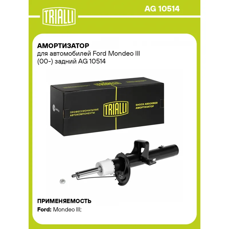 Амортизатор для автомобилей Ford Mondeo III (00-) задний Описание: Амортизатор AG 10514 бренда TRIALLI – это устройство для гашения колебаний (демпфирования) и поглощения толчков и ударов, действующих на раму. Особенности AG 10514: - Вид – Масляный с газовым подпором низкого давления; - Тип – Двухтрубный, гидравлический; Для крепления к деталям кузова или подвески используются крепления: верхнее Шток M12x1.25; и нижнее Зажим. Совместим с: FORD MONDEO.Подбор по VIN-номеру вашего автомобиля - через кнопку 'Задать вопрос'. Специалист проверит применяемость и ответит вам. Преимущества: - Инновационная технология производства; - Контроль качества каждой позиции по чертежам и с помощью 3D модели; - Сальник NOK; - Высокоэффективная система проектирования; - Гарантия до двух лет или 60 000 км пробега; Амортизаторы автомобильные существенно влияют на комфорт вождения, сокращая вибрации от неровностей дороги, что делает поездку более плавной и приятной. Регулярное и своевременное обслуживание амортизаторов помогут продлить их срок службы и обеспечить надёжную работу. Характеристики: Артикул: AG 10514 OEM номера: 1121964, 1121965, 1130112, 1130113, 1130114, 1132366, 1220625, 1220627, 1231606, 1231608, 1306194, 1306196, 1306199, 1306202, 1306203, 1S7118A076AB, 1S7118A076BA, 1S7118A076BC, 1S7118A076BD, 1S7118A076EA, 1S7118A076EB, 1S7118A076EC, 1S7118A140AB, 1S711BA076BB, 2S7118A076AB, 2S7118A076BB, 2S7118A076BC, 3S7118A076AB, 1132365, 1138239, 1205282, 1231607, 1231610, 1253785, 1254047, 1306198, 1306201, 1S7118A076AA, 1S7118A076AD, 1S7118A076AF, 1S7118A076BB, 1S7118A076BF, 1S7118A076DA, 1S7118A076DB, 1S7118A076DC, 1S7118A076FB, 1S7118K076AD, 1S7118K076AF, 1S7118K076AG, 1S7118K076AJ, 1S7118K076BA, 1S7118K076BF, 1S7118K076BG, 1S7118K076BJ, 1S7118K076DA, 1S7118K076DB, 1S7118K076EA, 1S7118K076EB, 1S7118K076FA, 1S7118K076FD, 2S7118A076AC, 2S7118A076BA, 2S7118A76BC, 2S7118K076AD, 2S7118K076BD, 3S7118A076AA Товарная линейка: BLACK Количество на автомобиль: 2 Вид амортизатора: Масляный с газовым подпором низкого давления Тип верхнего крепления: Шток Тип нижнего крепления: Зажим Диаметр корпуса, мм: 51 Диаметр штока, мм: 22 Ход штока, мм: 228 Размер резьбы штока: M12x1.25 Тип амортизатора: Двухтрубный, гидравлический Ось (сторона установки): Сзади, слева/справа Дополнительная информация: Упаковка изделия может отличаться от представленной на фото Присоединительная длина 2, мм: 604 Присоединительная длина 1, мм: 376 Сопутствующий товар: Ремонтные комплекты амортизаторов: BCS 2066 Сопутствующий товар: Амортизаторы: AG 10070 Гарантийный срок: 2 года/60 000 км Подходит для авто: Ford Mondeo III (00-) Для проверки применяемости отправьте VIN автомобиля через вкладку "Есть вопросы о товаре?" Комплектация: Амортизатор задний - 1 шт Гайка крепежная - 2 шт Болт - 1 шт Гарантия: от 1 года.
