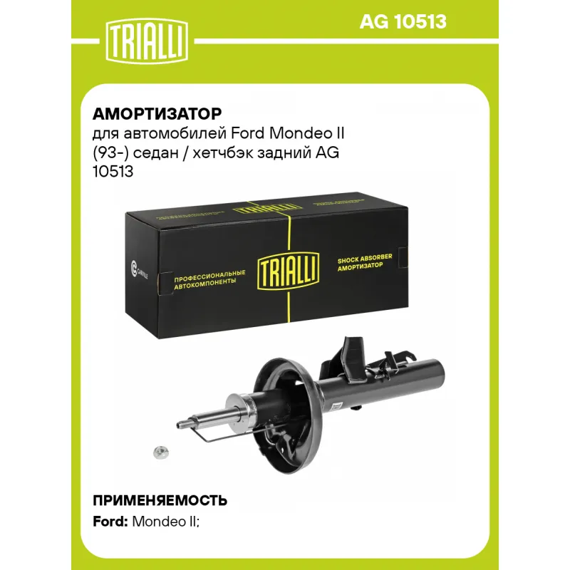 Амортизатор для автомобилей Ford Mondeo II (93-) седан / хетчбэк задний Описание: Амортизатор AG 10513 бренда TRIALLI – это устройство для гашения колебаний (демпфирования) и поглощения толчков и ударов, действующих на раму. Особенности AG 10513: - Вид – Масляный с газовым подпором низкого давления; - Тип – Двухтрубный, гидравлический; Для крепления к деталям кузова или подвески используются крепления: верхнее Шток M12x1.25; и нижнее Зажим. Совместим с: FORD MONDEO.Подбор по VIN-номеру вашего автомобиля - через кнопку 'Задать вопрос'. Специалист проверит применяемость и ответит вам. Преимущества: - Инновационная технология производства; - Контроль качества каждой позиции по чертежам и с помощью 3D модели; - Сальник NOK; - Высокоэффективная система проектирования; - Гарантия до двух лет или 60 000 км пробега; Амортизаторы автомобильные существенно влияют на комфорт вождения, сокращая вибрации от неровностей дороги, что делает поездку более плавной и приятной. Регулярное и своевременное обслуживание амортизаторов помогут продлить их срок службы и обеспечить надёжную работу. Характеристики: Артикул: AG 10513 OEM номера: 1104306, 1104307, 1093416 Товарная линейка: BLACK Количество на автомобиль: 2 Вид амортизатора: Масляный с газовым подпором низкого давления Тип верхнего крепления: Шток Тип нижнего крепления: Зажим Диаметр корпуса, мм: 51 Диаметр штока, мм: 22 Ход штока, мм: 250 Размер резьбы штока: M12x1.25 Тип амортизатора: Двухтрубный, гидравлический Ось (сторона установки): Сзади, слева/справа Дополнительная информация: Упаковка изделия может отличаться от представленной на фото Присоединительная длина 2, мм: 654 Присоединительная длина 1, мм: 404 Сопутствующий товар: Амортизаторы: AG 10069 Гарантийный срок: 2 года/60 000 км Подходит для авто: Ford Mondeo II (96-) Для проверки применяемости отправьте VIN автомобиля через вкладку "Есть вопросы о товаре?" Комплектация: Амортизатор задний - 1 шт Гайка крепежная - 1 шт Гарантия: от 1 года.