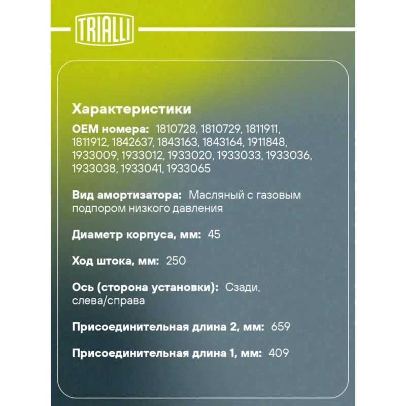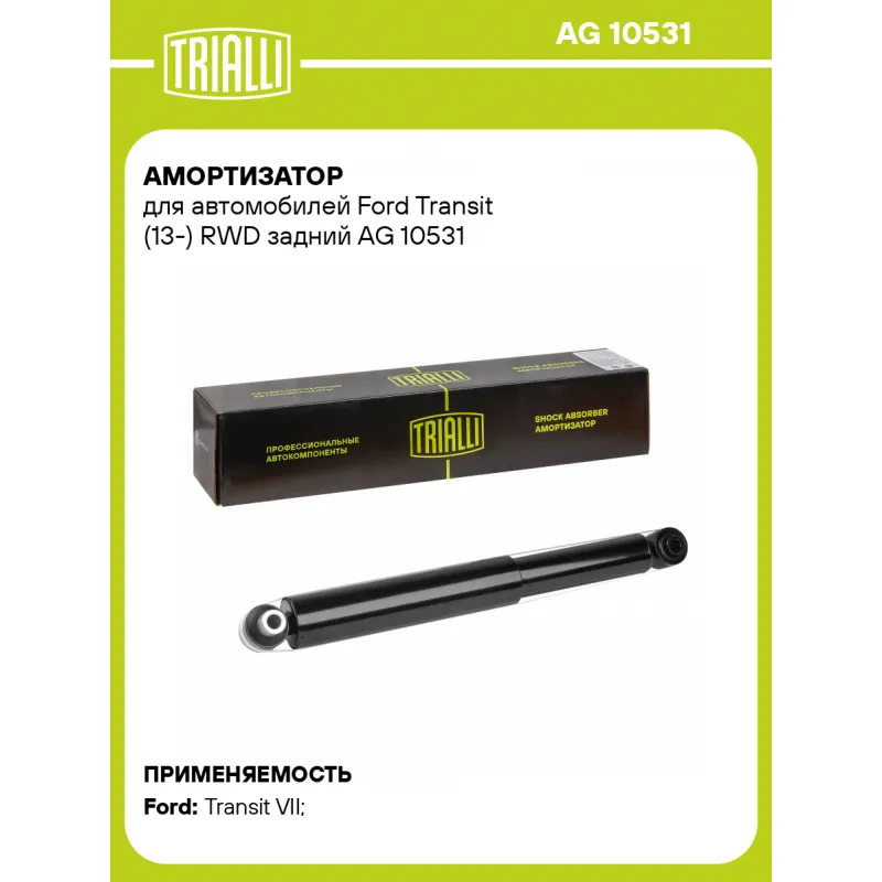 Амортизатор для автомобилей Ford Transit (13-) RWD задний Описание: Амортизатор AG 10531 бренда TRIALLI – это устройство для гашения колебаний (демпфирования) и поглощения толчков и ударов, действующих на раму. Особенности AG 10531: - Вид – Масляный с газовым подпором низкого давления; - Тип – Двухтрубный, гидравлический; Для крепления к деталям кузова или подвески используются крепления: верхнее Проушина/сайлентблок M12x1.25; и нижнее Проушина/сайлентблок. Совместим с: FORD TRANSIT, TRANSIT CUSTOM.Подбор по VIN-номеру вашего автомобиля - через кнопку 'Задать вопрос'. Специалист проверит применяемость и ответит вам. Преимущества: - Инновационная технология производства; - Контроль качества каждой позиции по чертежам и с помощью 3D модели; - Сальник NOK; - Высокоэффективная система проектирования; - Гарантия до двух лет или 60 000 км пробега; Амортизаторы автомобильные существенно влияют на комфорт вождения, сокращая вибрации от неровностей дороги, что делает поездку более плавной и приятной. Регулярное и своевременное обслуживание амортизаторов помогут продлить их срок службы и обеспечить надёжную работу. Характеристики: Артикул: AG 10531 OEM номера: 1810728, 1810729, 1811911, 1811912, 1842637, 1843163, 1843164, 1911848, 1933009, 1933012, 1933020, 1933033, 1933036, 1933038, 1933041, 1933065, 5272912, 5272913, BK31-18080-SA, BK31-18080-SB, BK31-18080-SC, BK31-18080-UA, BK31-18080-UB, BK31-18080-UC, BK31-18080-VC, CK41-18080-AC, CK41-18080-CC, CK41-18080-DC, CK41-18080-RA, CK41-18080-SA, CK41-18080-TA, FK31-18080-AA, FK31-18080-BA, FK31-18080-CA, FK31-18080-GA, FK31-18080-HA, FK31-18080-KA, FK31-18080-LA Товарная линейка: BLACK Количество на автомобиль: 2 Вид амортизатора: Масляный с газовым подпором низкого давления Тип верхнего крепления: Проушина/сайлентблок Тип нижнего крепления: Проушина/сайлентблок Диаметр корпуса, мм: 45 Диаметр штока, мм: 12.5 Ход штока, мм: 250 Размер резьбы штока: M12x1.25 Тип амортизатора: Двухтрубный, гидравлический Ось (сторона установки): Сзади, слева/справа Дополнительная информация: Для моделей: 260S, 280S, 280M, 300L, 300M, 300S Присоединительная длина 2, мм: 659 Присоединительная длина 1, мм: 409 Сопутствующий товар: Амортизаторы: AG 10068 Гарантийный срок: 2 года/60 000 км Подходит для авто: Ford Transit VII (06-), Transit VII (06-) Для проверки применяемости отправьте VIN автомобиля через вкладку "Есть вопросы о товаре?" Комплектация: Амортизатор задний - 1 шт Гарантия: от 1 года.