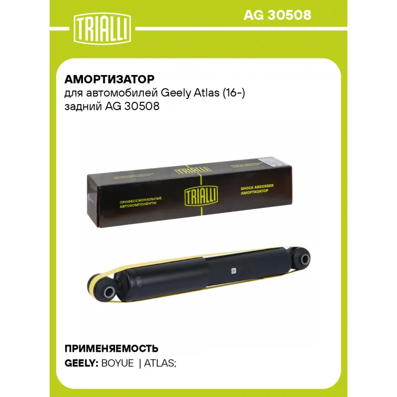 Амортизатор для автомобилей Geely Atlas (16-) задний Описание: Амортизатор AG 30508 бренда TRIALLI – это устройство для гашения колебаний (демпфирования) и поглощения толчков и ударов, действующих на раму. Особенности AG 30508: - Вид – Масляный с газовым подпором низкого давления; - Тип – Двухтрубный, гидравлический; Для крепления к деталям кузова или подвески используются крепления: верхнее Проушина/сайлентблок ; и нижнее Проушина/сайлентблок. Совместим с: GEELY ATLAS.Подбор по VIN-номеру вашего автомобиля - через кнопку 'Задать вопрос'. Специалист проверит применяемость и ответит вам. Преимущества: - Инновационная технология производства; - Контроль качества каждой позиции по чертежам и с помощью 3D модели; - Сальник NOK; - Высокоэффективная система проектирования; - Гарантия до двух лет или 60 000 км пробега; Амортизаторы автомобильные существенно влияют на комфорт вождения, сокращая вибрации от неровностей дороги, что делает поездку более плавной и приятной. Регулярное и своевременное обслуживание амортизаторов помогут продлить их срок службы и обеспечить надёжную работу. Характеристики: Артикул: AG 30508 OEM номера: 4020003800, 4020023900 Товарная линейка: BLACK Количество на автомобиль: 2 Вид амортизатора: Масляный с газовым подпором низкого давления Тип верхнего крепления: Проушина/сайлентблок Тип нижнего крепления: Проушина/сайлентблок Диаметр корпуса, мм: 45 Диаметр штока, мм: 15 Ход штока, мм: 110 Тип амортизатора: Двухтрубный, гидравлический Ось (сторона установки): Сзади, слева/справа Дополнительная информация: Упаковка изделия может отличаться от представленной на фото Присоединительная длина 2, мм: 405 Присоединительная длина 1, мм: 295 Сопутствующий товар: Амортизаторы: AG 30153, AG 30354 Гарантийный срок: 2 года/60 000 км Комплектация: Амортизатор задний - 1 шт Гарантия: от 1 года.