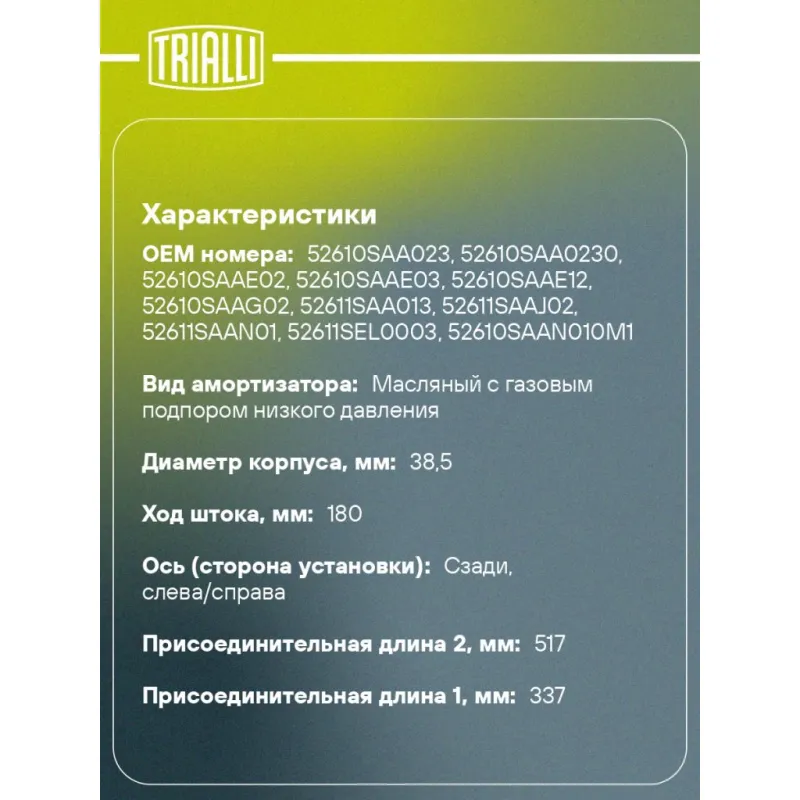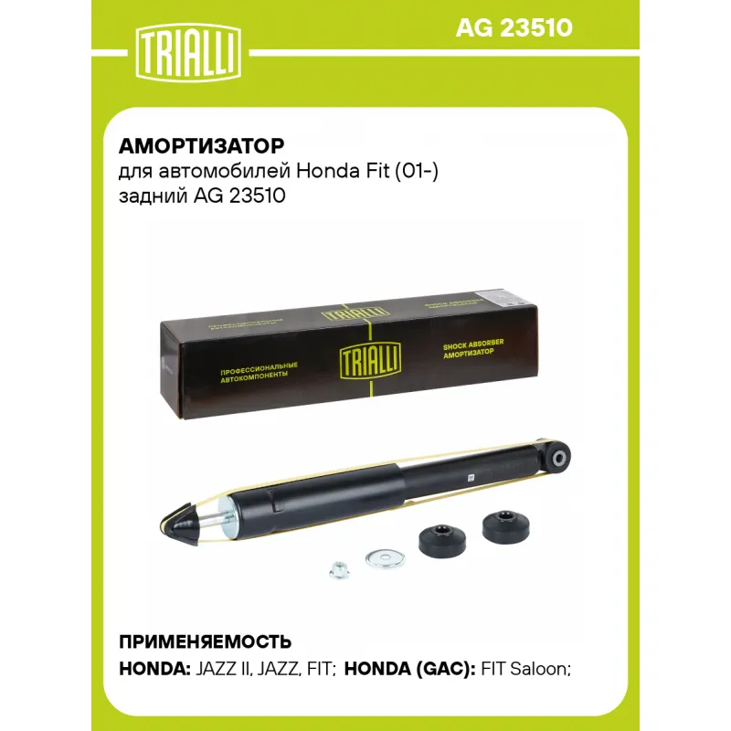 Амортизатор для автомобилей Honda Fit (01-) задний Описание: Амортизатор AG 23510 бренда TRIALLI – это устройство для гашения колебаний (демпфирования) и поглощения толчков и ударов, действующих на раму. Особенности AG 23510: - Вид – Масляный с газовым подпором низкого давления; - Тип – Двухтрубный, гидравлический; Для крепления к деталям кузова или подвески используются крепления: верхнее Шток M10x1,25; и нижнее Проушина/сайлентблок. Совместим с: HONDA JAZZ, CITY, FIT, HONDA (GAC) FIT.Подбор по VIN-номеру вашего автомобиля - через кнопку 'Задать вопрос'. Специалист проверит применяемость и ответит вам. Преимущества: - Инновационная технология производства; - Контроль качества каждой позиции по чертежам и с помощью 3D модели; - Сальник NOK; - Высокоэффективная система проектирования; - Гарантия до двух лет или 60 000 км пробега; Амортизаторы автомобильные существенно влияют на комфорт вождения, сокращая вибрации от неровностей дороги, что делает поездку более плавной и приятной. Регулярное и своевременное обслуживание амортизаторов помогут продлить их срок службы и обеспечить надёжную работу. Характеристики: Артикул: AG 23510 OEM номера: 52610SAA023, 52610SAA0230, 52610SAAE02, 52610SAAE03, 52610SAAE12, 52610SAAG02, 52611SAA013, 52611SAAJ02, 52611SAAN01, 52611SEL0003, 52610SAAN010M1, 52610SAGC020, 52610SEL0003, 52610SELT01, 52610SEMT01, 52610SENC02, 52610SAAJ02, 52610SAAJ020M1, 52610SAAJ021M1, 52610SAAJ11, 52610SAAJ110M1, 52610SAAN01 Товарная линейка: BLACK Количество на автомобиль: 2 Вид амортизатора: Масляный с газовым подпором низкого давления Тип верхнего крепления: Шток Тип нижнего крепления: Проушина/сайлентблок Диаметр корпуса, мм: 38.5 Диаметр штока, мм: 12.5 Ход штока, мм: 180 Размер резьбы штока: M10x1,25 Тип амортизатора: Двухтрубный, гидравлический Ось (сторона установки): Сзади, слева/справа Дополнительная информация: Упаковка изделия может отличаться от представленной на фото Присоединительная длина 2, мм: 517 Присоединительная длина 1, мм: 337 Гарантийный срок: 2 года/60 000 км Комплектация: Гайка крепежная - 1 шт Подушка резиновая - 2 шт Шайба - 1 шт Амортизатор задний - 1 шт Гарантия: от 1 года.