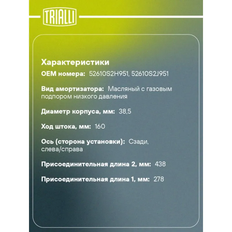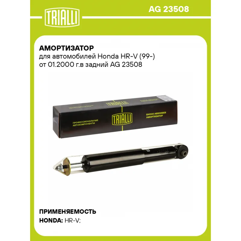 Амортизатор для автомобилей Honda HR-V (99-) от 01.2000 г.в задний Описание: Амортизатор AG 23508 бренда TRIALLI – это устройство для гашения колебаний (демпфирования) и поглощения толчков и ударов, действующих на раму. Особенности AG 23508: - Вид – Масляный с газовым подпором низкого давления; - Тип – Двухтрубный, гидравлический; Для крепления к деталям кузова или подвески используются крепления: верхнее Шток M10x1.25; и нижнее Проушина/сайлентблок. Совместим с: HONDA HR-V.Подбор по VIN-номеру вашего автомобиля - через кнопку 'Задать вопрос'. Специалист проверит применяемость и ответит вам. Преимущества: - Инновационная технология производства; - Контроль качества каждой позиции по чертежам и с помощью 3D модели; - Сальник NOK; - Высокоэффективная система проектирования; - Гарантия до двух лет или 60 000 км пробега; Амортизаторы автомобильные существенно влияют на комфорт вождения, сокращая вибрации от неровностей дороги, что делает поездку более плавной и приятной. Регулярное и своевременное обслуживание амортизаторов помогут продлить их срок службы и обеспечить надёжную работу. Характеристики: Артикул: AG 23508 OEM номера: 52610S2H951, 52610S2J951 Товарная линейка: BLACK Количество на автомобиль: 2 Вид амортизатора: Масляный с газовым подпором низкого давления Тип верхнего крепления: Шток Тип нижнего крепления: Проушина/сайлентблок Диаметр корпуса, мм: 38.5 Диаметр штока, мм: 12.5 Ход штока, мм: 160 Размер резьбы штока: M10x1.25 Тип амортизатора: Двухтрубный, гидравлический Ось (сторона установки): Сзади, слева/справа Дополнительная информация: Упаковка изделия может отличаться от представленной на фото Присоединительная длина 2, мм: 438 Присоединительная длина 1, мм: 278 Сопутствующий товар: Амортизаторы: AG 23161, AG 23362 Гарантийный срок: 2 года/60 000 км Комплектация: Амортизатор задний - 1 шт Шайба - 1 шт Втулка дистанционная - 1 шт Гайка крепежная - 1 шт Гарантия: от 1 года.