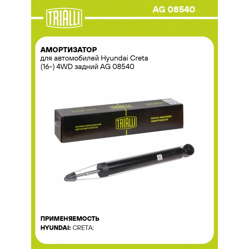 Амортизатор для автомобилей Hyundai Creta (16-) 4WD задний Описание: Амортизатор AG 08540 бренда TRIALLI – это устройство для гашения колебаний (демпфирования) и поглощения толчков и ударов, действующих на раму. Особенности AG 08540: - Вид – Масляный с газовым подпором низкого давления; - Тип – Двухтрубный, гидравлический; Для крепления к деталям кузова или подвески используются крепления: верхнее Шток Mx1,25; и нижнее Проушина/сайлентблок. Совместим с: HYUNDAI CRETA.Подбор по VIN-номеру вашего автомобиля - через кнопку 'Задать вопрос'. Специалист проверит применяемость и ответит вам. Преимущества: - Инновационная технология производства; - Контроль качества каждой позиции по чертежам и с помощью 3D модели; - Сальник NOK; - Высокоэффективная система проектирования; - Гарантия до двух лет или 60 000 км пробега; Амортизаторы автомобильные существенно влияют на комфорт вождения, сокращая вибрации от неровностей дороги, что делает поездку более плавной и приятной. Регулярное и своевременное обслуживание амортизаторов помогут продлить их срок службы и обеспечить надёжную работу. Характеристики: Артикул: AG 08540 OEM номера: 55310-M0100, 55310-M0200, 55300-C9100, 55310-C9100 Товарная линейка: BLACK Количество на автомобиль: 2 Вид амортизатора: Масляный с газовым подпором низкого давления Тип верхнего крепления: Шток Тип нижнего крепления: Проушина/сайлентблок Диаметр корпуса, мм: 45 Диаметр штока, мм: 12,5 Ход штока, мм: 170 Размер резьбы штока: Mx1,25 Тип амортизатора: Двухтрубный, гидравлический Ось (сторона установки): Сзади, слева/справа Дополнительная информация: Для а/м с полным приводом Присоединительная длина 2, мм: 565 Присоединительная длина 1, мм: 395 Сопутствующий товар: Амортизаторы: AG 08107; AG 08308 Гарантийный срок: 2 года/60 000 км Комплектация: Амортизатор задний - 1 шт Гайка крепежная - 1 шт Шарнир резинометаллический - 1 шт Гарантия: от 1 года.