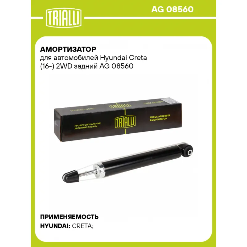 Амортизатор для автомобилей Hyundai Creta (16-) 2WD задний Описание: Амортизатор AG 08560 бренда TRIALLI – это устройство для гашения колебаний (демпфирования) и поглощения толчков и ударов, действующих на раму. Особенности AG 08560: - Вид – Масляный с газовым подпором низкого давления; - Тип – Двухтрубный, гидравлический; Для крепления к деталям кузова или подвески используются крепления: верхнее Шток M10 x 1,25; и нижнее Проушина/сайлентблок. Совместим с: HYUNDAI CRETA.Подбор по VIN-номеру вашего автомобиля - через кнопку 'Задать вопрос'. Специалист проверит применяемость и ответит вам. Преимущества: - Инновационная технология производства; - Контроль качества каждой позиции по чертежам и с помощью 3D модели; - Сальник NOK; - Высокоэффективная система проектирования; - Гарантия до двух лет или 60 000 км пробега; Амортизаторы автомобильные существенно влияют на комфорт вождения, сокращая вибрации от неровностей дороги, что делает поездку более плавной и приятной. Регулярное и своевременное обслуживание амортизаторов помогут продлить их срок службы и обеспечить надёжную работу. Характеристики: Артикул: AG 08560 OEM номера: 55310-M0000, 55300-C9000, 55300-M4000, 55310-A0000, 55310-C9000, 55310-D8000, 55310-M4000, 55310-M4100, 55310-M4500, 55307-BW000 Товарная линейка: BLACK Количество на автомобиль: 2 Вид амортизатора: Масляный с газовым подпором низкого давления Тип верхнего крепления: Шток Тип нижнего крепления: Проушина/сайлентблок Диаметр корпуса, мм: 45 Диаметр штока, мм: 12,5 Ход штока, мм: 209 Размер резьбы штока: M10 x 1,25 Тип амортизатора: Двухтрубный, гидравлический Ось (сторона установки): Сзади, слева/справа Дополнительная информация: Упаковка изделия может отличаться от представленной на фото Присоединительная длина 2, мм: 564 Присоединительная длина 1, мм: 355 Сопутствующий товар: Амортизаторы: AG 08107, AG 08308 Гарантийный срок: 2 года/60 000 км Комплектация: Амортизатор задний - 1 шт Гайка крепежная - 1 шт Шарнир резинометаллический - 1 шт Гарантия: от 1 года.
