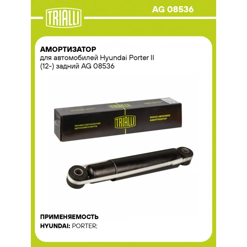 Амортизатор для автомобилей Hyundai Porter II (12-) задний Описание: Амортизатор AG 08536 бренда TRIALLI – это устройство для гашения колебаний (демпфирования) и поглощения толчков и ударов, действующих на раму. Особенности AG 08536: - Вид – Масляный с газовым подпором низкого давления; - Тип – Двухтрубный, гидравлический; Для крепления к деталям кузова или подвески используются крепления: верхнее Проушина/сайлентблок ; и нижнее Проушина/сайлентблок. Совместим с: HYUNDAI PORTER.Подбор по VIN-номеру вашего автомобиля - через кнопку 'Задать вопрос'. Специалист проверит применяемость и ответит вам. Преимущества: - Инновационная технология производства; - Контроль качества каждой позиции по чертежам и с помощью 3D модели; - Сальник NOK; - Высокоэффективная система проектирования; - Гарантия до двух лет или 60 000 км пробега; Амортизаторы автомобильные существенно влияют на комфорт вождения, сокращая вибрации от неровностей дороги, что делает поездку более плавной и приятной. Регулярное и своевременное обслуживание амортизаторов помогут продлить их срок службы и обеспечить надёжную работу. Характеристики: Артикул: AG 08536 OEM номера: 553004F050 Товарная линейка: BLACK Количество на автомобиль: 2 Вид амортизатора: Масляный с газовым подпором низкого давления Тип верхнего крепления: Проушина/сайлентблок Тип нижнего крепления: Проушина/сайлентблок Диаметр корпуса, мм: 45 Диаметр штока, мм: 12.5 Ход штока, мм: 185 Тип амортизатора: Двухтрубный, гидравлический Ось (сторона установки): Сзади, слева/справа Дополнительная информация: Упаковка изделия может отличаться от представленной на фото Присоединительная длина 2, мм: 490 Присоединительная длина 1, мм: 305 Сопутствующий товар: Амортизаторы: AG 08035 Гарантийный срок: 2 года/60 000 км Комплектация: Амортизатор задний - 1 шт Гарантия: от 1 года.