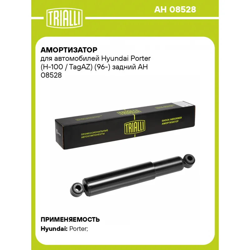 Амортизатор для автомобилей Hyundai Porter (H-100 / TagAZ) (96-) задний Описание: Амортизатор AH 08528 бренда TRIALLI – это устройство для гашения колебаний (демпфирования) и поглощения толчков и ударов, действующих на раму. Особенности AH 08528: - Вид – Масляный; - Тип – Двухтрубный, гидравлический; Для крепления к деталям кузова или подвески используются крепления: верхнее Проушина/сайлентблок ; и нижнее Проушина/сайлентблок. Совместим с: HYUNDAI H100, PORTER.Подбор по VIN-номеру вашего автомобиля - через кнопку 'Задать вопрос'. Специалист проверит применяемость и ответит вам. Преимущества: - Инновационная технология производства; - Контроль качества каждой позиции по чертежам и с помощью 3D модели; - Сальник NOK; - Высокоэффективная система проектирования; - Гарантия до двух лет или 60 000 км пробега; Амортизаторы автомобильные существенно влияют на комфорт вождения, сокращая вибрации от неровностей дороги, что делает поездку более плавной и приятной. Регулярное и своевременное обслуживание амортизаторов помогут продлить их срок службы и обеспечить надёжную работу. Характеристики: Артикул: AH 08528 OEM номера: 553004B000, 553004B700 Товарная линейка: BLACK Количество на автомобиль: 2 Вид амортизатора: Масляный Тип верхнего крепления: Проушина/сайлентблок Тип нижнего крепления: Проушина/сайлентблок Диаметр корпуса, мм: 45 Диаметр штока, мм: 14 Ход штока, мм: 190 Тип амортизатора: Двухтрубный, гидравлический Ось (сторона установки): Сзади, слева/справа Дополнительная информация: Упаковка изделия может отличаться от представленной на фото Присоединительная длина 2, мм: 506 Присоединительная длина 1, мм: 316 Сопутствующий товар: Амортизаторы: AH 08029 Гарантийный срок: 2 года/60 000 км Подходит для авто: Hyundai Porter (H-100/TagAZ) (96-) Для проверки применяемости отправьте VIN автомобиля через вкладку "Есть вопросы о товаре?" Комплектация: Амортизатор задний - 1 шт Шарнир резинометаллический - 2 шт Гарантия: от 1 года.