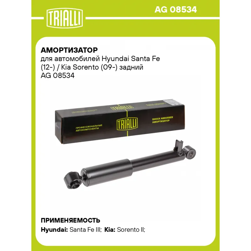 Амортизатор для автомобилей Hyundai Santa Fe (12-) / Kia Sorento (09-) задний Описание: Амортизатор AG 08534 бренда TRIALLI – это устройство для гашения колебаний (демпфирования) и поглощения толчков и ударов, действующих на раму. Особенности AG 08534: - Вид – Масляный с газовым подпором низкого давления; - Тип – Двухтрубный, гидравлический; Для крепления к деталям кузова или подвески используются крепления: верхнее Проушина/сайлентблок ; и нижнее Проушина/сайлентблок. Совместим с: HYUNDAI SANTA FE, KIA SORENTO.Подбор по VIN-номеру вашего автомобиля - через кнопку 'Задать вопрос'. Специалист проверит применяемость и ответит вам. Преимущества: - Инновационная технология производства; - Контроль качества каждой позиции по чертежам и с помощью 3D модели; - Сальник NOK; - Высокоэффективная система проектирования; - Гарантия до двух лет или 60 000 км пробега; Амортизаторы автомобильные существенно влияют на комфорт вождения, сокращая вибрации от неровностей дороги, что делает поездку более плавной и приятной. Регулярное и своевременное обслуживание амортизаторов помогут продлить их срок службы и обеспечить надёжную работу. Характеристики: Артикул: AG 08534 OEM номера: 553102W010, 553102W110, 553102P400, 553101U700, 553101U710, 553102P430, 553102W530, 553104Z000, 553104Z100, 553104Z500, 553104Z600, 55310A1100, 55310B8300, 55310B8350 Товарная линейка: BLACK Количество на автомобиль: 2 Вид амортизатора: Масляный с газовым подпором низкого давления Тип верхнего крепления: Проушина/сайлентблок Тип нижнего крепления: Проушина/сайлентблок Диаметр корпуса, мм: 45 Диаметр штока, мм: 15 Ход штока, мм: 156 Тип амортизатора: Двухтрубный, гидравлический Ось (сторона установки): Сзади, слева/справа Дополнительная информация: Упаковка изделия может отличаться от представленной на фото Присоединительная длина 2, мм: 480 Присоединительная длина 1, мм: 324 Сопутствующий товар: Амортизаторы: AG 08101; AG 08302; AG 08523 Гарантийный срок: 2 года/60 000 км Подходит для авто: Hyundai Santa Fe III (12-) Kia Sorento II (09-) Для проверки применяемости отправьте VIN автомобиля через вкладку "Есть вопросы о товаре?" Комплектация: Амортизатор задний - 1 шт Шарнир резинометаллический - 2 шт Гарантия: от 1 года.