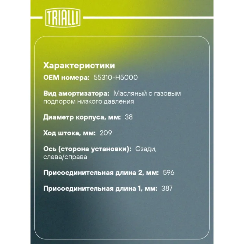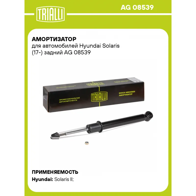 Амортизатор для автомобилей Hyundai Solaris (17-) задний Описание: Амортизатор AG 08539 бренда TRIALLI – это устройство для гашения колебаний (демпфирования) и поглощения толчков и ударов, действующих на раму. Особенности AG 08539: - Вид – Масляный с газовым подпором низкого давления; - Тип – Двухтрубный, гидравлический; Для крепления к деталям кузова или подвески используются крепления: верхнее Шток M10x1.25; и нижнее Проушина/сайлентблок. Совместим с: HYUNDAI SOLARIS.Подбор по VIN-номеру вашего автомобиля - через кнопку 'Задать вопрос'. Специалист проверит применяемость и ответит вам. Преимущества: - Инновационная технология производства; - Контроль качества каждой позиции по чертежам и с помощью 3D модели; - Сальник NOK; - Высокоэффективная система проектирования; - Гарантия до двух лет или 60 000 км пробега; Амортизаторы автомобильные существенно влияют на комфорт вождения, сокращая вибрации от неровностей дороги, что делает поездку более плавной и приятной. Регулярное и своевременное обслуживание амортизаторов помогут продлить их срок службы и обеспечить надёжную работу. Характеристики: Артикул: AG 08539 OEM номера: 55310-H5000 Товарная линейка: BLACK Количество на автомобиль: 2 Вид амортизатора: Масляный с газовым подпором низкого давления Тип верхнего крепления: Шток Тип нижнего крепления: Проушина/сайлентблок Диаметр корпуса, мм: 38 Диаметр штока, мм: 12,5 Ход штока, мм: 209 Размер резьбы штока: M10x1.25 Тип амортизатора: Двухтрубный, гидравлический Ось (сторона установки): Сзади, слева/справа Дополнительная информация: Упаковка изделия может отличаться от представленной на фото Присоединительная длина 2, мм: 596 Присоединительная длина 1, мм: 387 Сопутствующий товар: Ремонтные комплекты амортизаторов: BC 0802; BC 0852; BCS 0802 Сопутствующий товар: Амортизаторы: AG 08148; AG 08349 Гарантийный срок: 2 года/60 000 км Подходит для авто: Hyundai Solaris II (17-) Для проверки применяемости отправьте VIN автомобиля через вкладку "Есть вопросы о товаре?" Комплектация: Амортизатор задний - 1 шт Гайка крепежная - 1 шт Шарнир резинометаллический - 1 шт Гарантия: от 1 года.