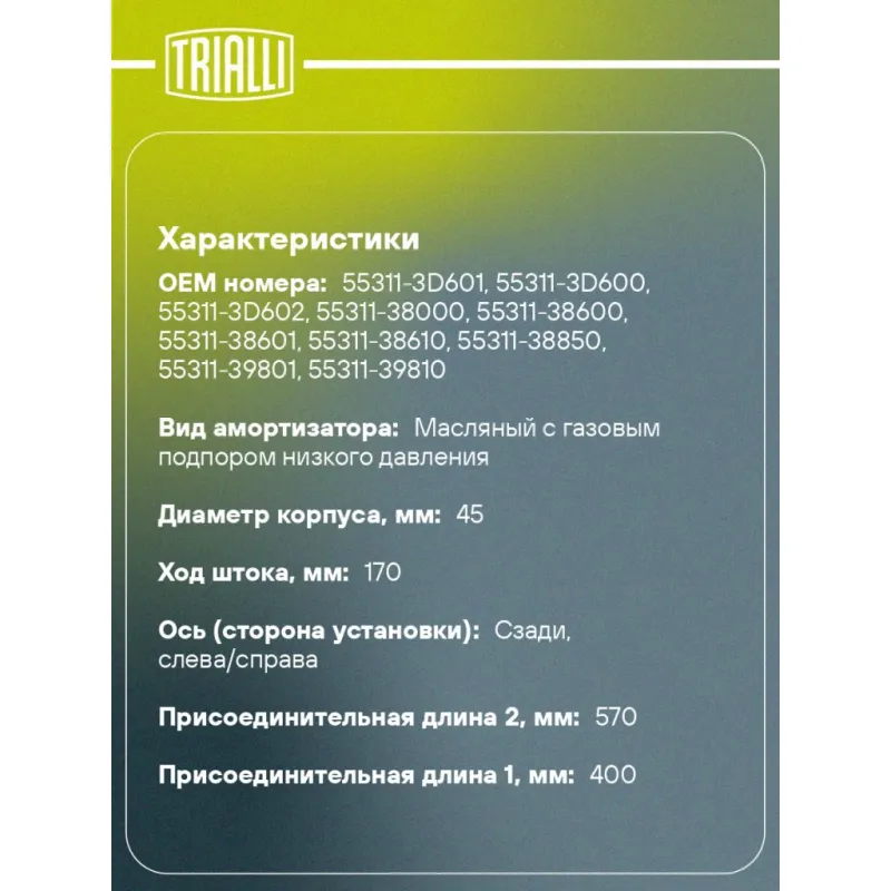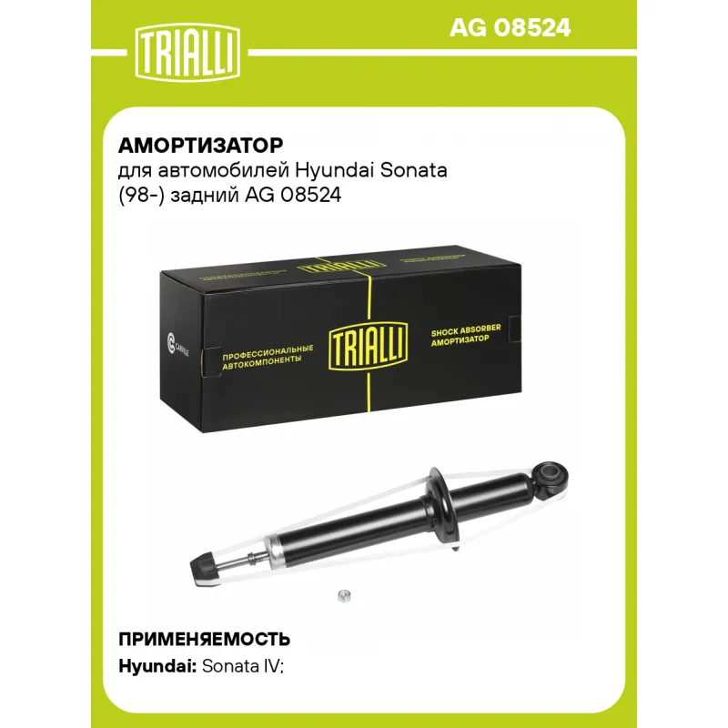 Амортизатор для автомобилей Hyundai Sonata (98-) задний Описание: Амортизатор AG 08524 бренда TRIALLI – это устройство для гашения колебаний (демпфирования) и поглощения толчков и ударов, действующих на раму. Особенности AG 08524: - Вид – Масляный с газовым подпором низкого давления; - Тип – Двухтрубный, гидравлический; Для крепления к деталям кузова или подвески используются крепления: верхнее Шток M10x1.25; и нижнее Проушина/сайлентблок. Совместим с: HYUNDAI SONATA.Подбор по VIN-номеру вашего автомобиля - через кнопку 'Задать вопрос'. Специалист проверит применяемость и ответит вам. Преимущества: - Инновационная технология производства; - Контроль качества каждой позиции по чертежам и с помощью 3D модели; - Сальник NOK; - Высокоэффективная система проектирования; - Гарантия до двух лет или 60 000 км пробега; Амортизаторы автомобильные существенно влияют на комфорт вождения, сокращая вибрации от неровностей дороги, что делает поездку более плавной и приятной. Регулярное и своевременное обслуживание амортизаторов помогут продлить их срок службы и обеспечить надёжную работу. Характеристики: Артикул: AG 08524 OEM номера: 55311-3D601, 55311-3D600, 55311-3D602, 55311-38000, 55311-38600, 55311-38601, 55311-38610, 55311-38850, 55311-39801, 55311-39810 Товарная линейка: BLACK Количество на автомобиль: 2 Вид амортизатора: Масляный с газовым подпором низкого давления Тип верхнего крепления: Шток Тип нижнего крепления: Проушина/сайлентблок Диаметр корпуса, мм: 45 Диаметр штока, мм: 12,5 Ход штока, мм: 170 Размер резьбы штока: M10x1.25 Тип амортизатора: Двухтрубный, гидравлический Ось (сторона установки): Сзади, слева/справа Дополнительная информация: Упаковка изделия может отличаться от представленной на фото Присоединительная длина 2, мм: 570 Присоединительная длина 1, мм: 400 Сопутствующий товар: Амортизаторы: AG 08087 Гарантийный срок: 2 года/60 000 км Подходит для авто: Hyundai Sonata IV (EF) (98-) Для проверки применяемости отправьте VIN автомобиля через вкладку "Есть вопросы о товаре?" Комплектация: Амортизатор задний - 1 шт Гайка крепежная - 1 шт Шарнир резинометаллический - 1 шт Гарантия: от 1 года.
