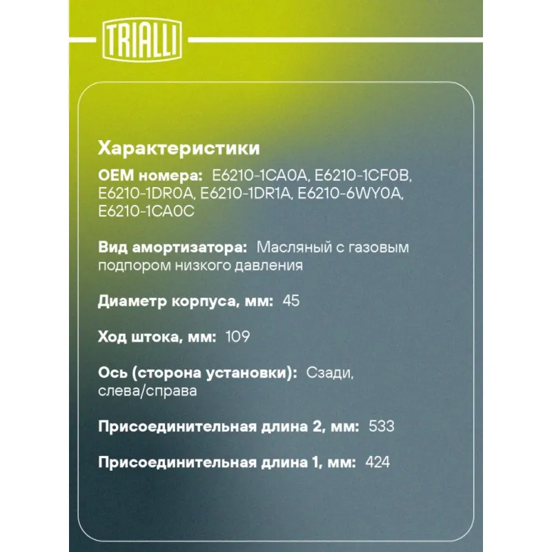 Амортизатор для автомобилей Infinity FX (08-) задний Описание: Амортизатор AG 14516 бренда TRIALLI – это устройство для гашения колебаний (демпфирования) и поглощения толчков и ударов, действующих на раму. Особенности AG 14516: - Вид – Масляный с газовым подпором низкого давления; - Тип – Двухтрубный, гидравлический; Для крепления к деталям кузова или подвески используются крепления: верхнее Шток M12x1,25; и нижнее Проушина/сайлентблок. Совместим с: INFINITI FX.Подбор по VIN-номеру вашего автомобиля - через кнопку 'Задать вопрос'. Специалист проверит применяемость и ответит вам. Преимущества: - Инновационная технология производства; - Контроль качества каждой позиции по чертежам и с помощью 3D модели; - Сальник NOK; - Высокоэффективная система проектирования; - Гарантия до двух лет или 60 000 км пробега; Амортизаторы автомобильные существенно влияют на комфорт вождения, сокращая вибрации от неровностей дороги, что делает поездку более плавной и приятной. Регулярное и своевременное обслуживание амортизаторов помогут продлить их срок службы и обеспечить надёжную работу. Характеристики: Артикул: AG 14516 OEM номера: E6210-1CA0A, E6210-1CF0B, E6210-1DR0A, E6210-1DR1A, E6210-6WY0A, E6210-1CA0C Товарная линейка: BLACK Количество на автомобиль: 2 Вид амортизатора: Масляный с газовым подпором низкого давления Тип верхнего крепления: Шток Тип нижнего крепления: Проушина/сайлентблок Диаметр корпуса, мм: 45 Диаметр штока, мм: 12,5 Ход штока, мм: 109 Размер резьбы штока: M12x1,25 Тип амортизатора: Двухтрубный, гидравлический Ось (сторона установки): Сзади, слева/справа Дополнительная информация: Упаковка изделия может отличаться от представленной на фото Присоединительная длина 2, мм: 533 Присоединительная длина 1, мм: 424 Сопутствующий товар: Амортизаторы: AG 14179, AG 14380 Гарантийный срок: 2 года/60 000 км Комплектация: Гайка крепежная - 1 шт Амортизатор задний - 1 шт Гарантия: от 1 года.