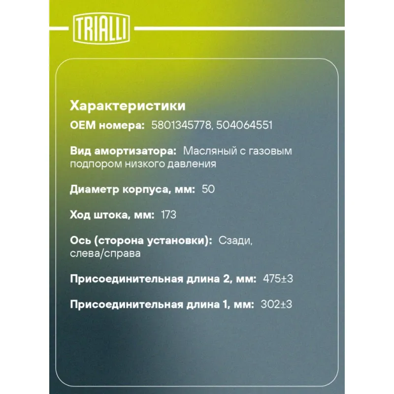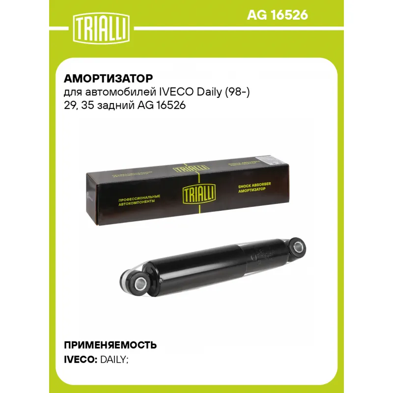 Амортизатор для автомобилей IVECO Daily (98-) 29, 35 задний Описание: Амортизатор AG 16526 бренда TRIALLI – это устройство для гашения колебаний (демпфирования) и поглощения толчков и ударов, действующих на раму. Особенности AG 16526: - Вид – Масляный с газовым подпором низкого давления; - Тип – Двухтрубный, гидравлический; Для крепления к деталям кузова или подвески используются крепления: верхнее Проушина/сайлентблок ; и нижнее Проушина/сайлентблок. Совместим с: IVECO DAILY.Подбор по VIN-номеру вашего автомобиля - через кнопку 'Задать вопрос'. Специалист проверит применяемость и ответит вам. Преимущества: - Инновационная технология производства; - Контроль качества каждой позиции по чертежам и с помощью 3D модели; - Сальник NOK; - Высокоэффективная система проектирования; - Гарантия до двух лет или 60 000 км пробега; Амортизаторы автомобильные существенно влияют на комфорт вождения, сокращая вибрации от неровностей дороги, что делает поездку более плавной и приятной. Регулярное и своевременное обслуживание амортизаторов помогут продлить их срок службы и обеспечить надёжную работу. Характеристики: Артикул: AG 16526 OEM номера: 5801345778, 504064551 Товарная линейка: BLACK Количество на автомобиль: 2 Вид амортизатора: Масляный с газовым подпором низкого давления Тип верхнего крепления: Проушина/сайлентблок Тип нижнего крепления: Проушина/сайлентблок Диаметр корпуса, мм: 50 Диаметр штока, мм: 15 Ход штока, мм: 173 Тип амортизатора: Двухтрубный, гидравлический Ось (сторона установки): Сзади, слева/справа Дополнительная информация: Упаковка изделия может отличаться от представленной на фото Присоединительная длина 2, мм: 475±3 Присоединительная длина 1, мм: 302±3 Сопутствующий товар: Амортизаторы: AH 16004, AG 16001, AH 16006 Гарантийный срок: 2 года/60 000 км Комплектация: Амортизатор задний - 1 шт Шарнир резинометаллический - 2 шт Гарантия: от 1 года.