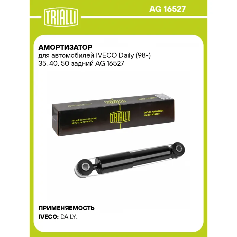 Амортизатор для автомобилей IVECO Daily (98-) 35, 40, 50 задний Описание: Амортизатор AG 16527 бренда TRIALLI – это устройство для гашения колебаний (демпфирования) и поглощения толчков и ударов, действующих на раму. Особенности AG 16527: - Вид – Масляный с газовым подпором низкого давления; - Тип – Двухтрубный, гидравлический; Для крепления к деталям кузова или подвески используются крепления: верхнее Проушина/сайлентблок ; и нижнее Проушина/сайлентблок. Совместим с: IVECO DAILY.Подбор по VIN-номеру вашего автомобиля - через кнопку 'Задать вопрос'. Специалист проверит применяемость и ответит вам. Преимущества: - Инновационная технология производства; - Контроль качества каждой позиции по чертежам и с помощью 3D модели; - Сальник NOK; - Высокоэффективная система проектирования; - Гарантия до двух лет или 60 000 км пробега; Амортизаторы автомобильные существенно влияют на комфорт вождения, сокращая вибрации от неровностей дороги, что делает поездку более плавной и приятной. Регулярное и своевременное обслуживание амортизаторов помогут продлить их срок службы и обеспечить надёжную работу. Характеристики: Артикул: AG 16527 OEM номера: 5801345773, 504118552 Товарная линейка: BLACK Количество на автомобиль: 2 Вид амортизатора: Масляный с газовым подпором низкого давления Тип верхнего крепления: Проушина/сайлентблок Тип нижнего крепления: Проушина/сайлентблок Диаметр корпуса, мм: 45 Диаметр штока, мм: 12.5 Ход штока, мм: 100 Тип амортизатора: Двухтрубный, гидравлический Ось (сторона установки): Сзади, слева/справа Дополнительная информация: Упаковка изделия может отличаться от представленной на фото Присоединительная длина 2, мм: 400 Присоединительная длина 1, мм: 300 Гарантийный срок: 2 года/60 000 км Комплектация: Амортизатор задний - 1 шт Гарантия: от 1 года.
