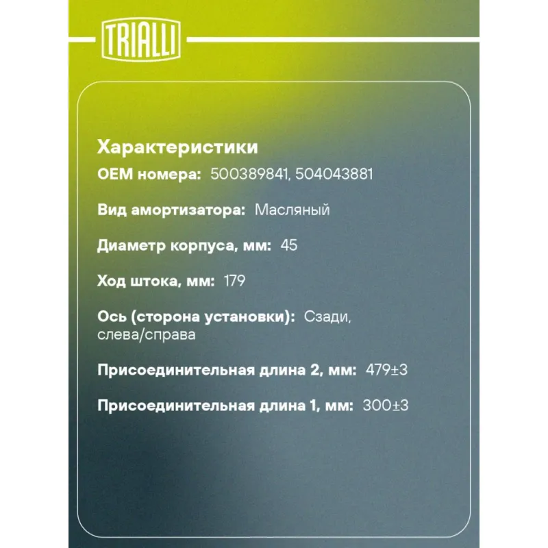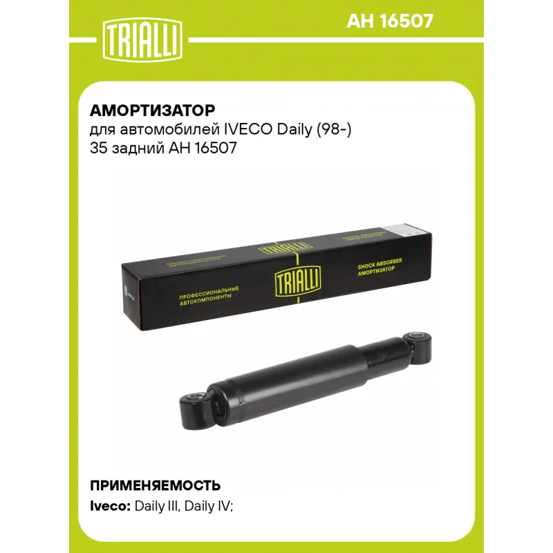 Амортизатор для автомобилей IVECO Daily (98-) 35 задний Описание: Амортизатор AH 16507 бренда TRIALLI – это устройство для гашения колебаний (демпфирования) и поглощения толчков и ударов, действующих на раму. Особенности AH 16507: - Вид – Масляный; - Тип – Двухтрубный, гидравлический; Для крепления к деталям кузова или подвески используются крепления: верхнее Проушина/сайлентблок ; и нижнее Проушина/сайлентблок. Совместим с: IVECO DAILY.Подбор по VIN-номеру вашего автомобиля - через кнопку 'Задать вопрос'. Специалист проверит применяемость и ответит вам. Преимущества: - Инновационная технология производства; - Контроль качества каждой позиции по чертежам и с помощью 3D модели; - Сальник NOK; - Высокоэффективная система проектирования; - Гарантия до двух лет или 60 000 км пробега; Амортизаторы автомобильные существенно влияют на комфорт вождения, сокращая вибрации от неровностей дороги, что делает поездку более плавной и приятной. Регулярное и своевременное обслуживание амортизаторов помогут продлить их срок службы и обеспечить надёжную работу. Характеристики: Артикул: AH 16507 OEM номера: 500389841, 504043881 Товарная линейка: BLACK Количество на автомобиль: 2 Вид амортизатора: Масляный Тип верхнего крепления: Проушина/сайлентблок Тип нижнего крепления: Проушина/сайлентблок Диаметр корпуса, мм: 45 Диаметр штока, мм: 12.5 Ход штока, мм: 179 Тип амортизатора: Двухтрубный, гидравлический Ось (сторона установки): Сзади, слева/справа Дополнительная информация: Для а/м грузоподъёмностью более 1200 кг серии 35S, 35C, 40С, 45С, 50С Присоединительная длина 2, мм: 479±3 Присоединительная длина 1, мм: 300±3 Гарантийный срок: 2 года/60 000 км Подходит для авто: Iveco Daily III (99-), Daily IV (06-) Для проверки применяемости отправьте VIN автомобиля через вкладку "Есть вопросы о товаре?" Комплектация: Амортизатор задний - 1 шт Шарнир резинометаллический - 2 шт Гарантия: от 1 года.
