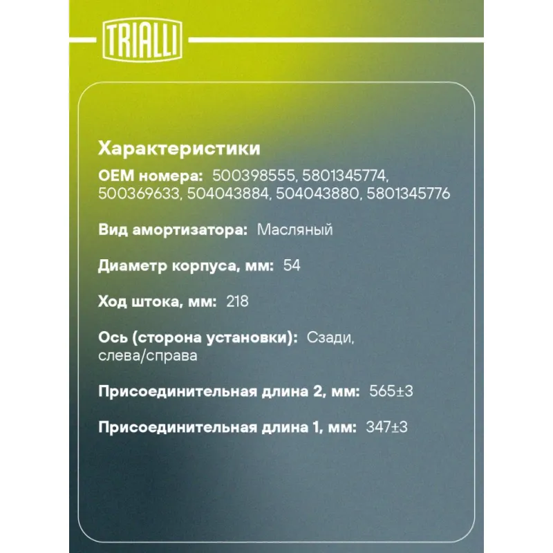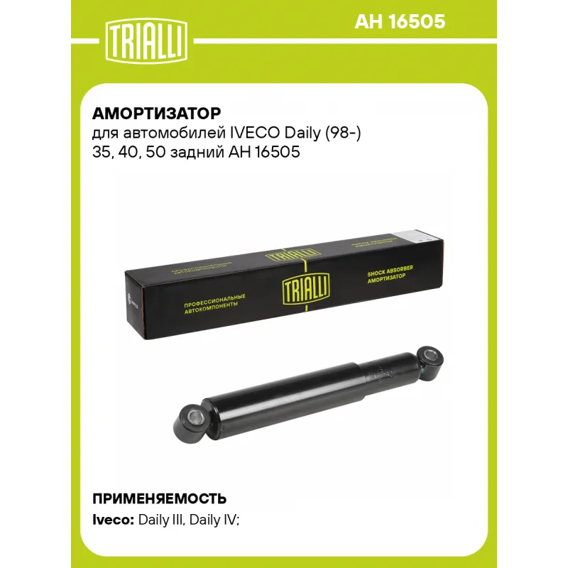 Амортизатор для автомобилей IVECO Daily (98-) 35, 40, 50 задний Описание: Амортизатор AH 16505 бренда TRIALLI – это устройство для гашения колебаний (демпфирования) и поглощения толчков и ударов, действующих на раму. Особенности AH 16505: - Вид – Масляный; - Тип – Двухтрубный, гидравлический; Для крепления к деталям кузова или подвески используются крепления: верхнее Проушина/сайлентблок ; и нижнее Проушина/сайлентблок. Совместим с: IVECO DAILY.Подбор по VIN-номеру вашего автомобиля - через кнопку 'Задать вопрос'. Специалист проверит применяемость и ответит вам. Преимущества: - Инновационная технология производства; - Контроль качества каждой позиции по чертежам и с помощью 3D модели; - Сальник NOK; - Высокоэффективная система проектирования; - Гарантия до двух лет или 60 000 км пробега; Амортизаторы автомобильные существенно влияют на комфорт вождения, сокращая вибрации от неровностей дороги, что делает поездку более плавной и приятной. Регулярное и своевременное обслуживание амортизаторов помогут продлить их срок службы и обеспечить надёжную работу. Характеристики: Артикул: AH 16505 OEM номера: 500398555, 5801345774, 500369633, 504043884, 504043880, 5801345776 Товарная линейка: BLACK Количество на автомобиль: 2 Вид амортизатора: Масляный Тип верхнего крепления: Проушина/сайлентблок Тип нижнего крепления: Проушина/сайлентблок Диаметр корпуса, мм: 54 Диаметр штока, мм: 12,4 Ход штока, мм: 218 Тип амортизатора: Двухтрубный, гидравлический Ось (сторона установки): Сзади, слева/справа Дополнительная информация: Для а/м грузоподъёмностью до 1200 кг серии 29L, 35S и 25C Присоединительная длина 2, мм: 565±3 Присоединительная длина 1, мм: 347±3 Гарантийный срок: 2 года/60 000 км Подходит для авто: Iveco Daily III (99-), Daily IV (06-) Для проверки применяемости отправьте VIN автомобиля через вкладку "Есть вопросы о товаре?" Комплектация: Амортизатор задний - 1 шт Шарнир резинометаллический - 2 шт Гарантия: от 1 года.