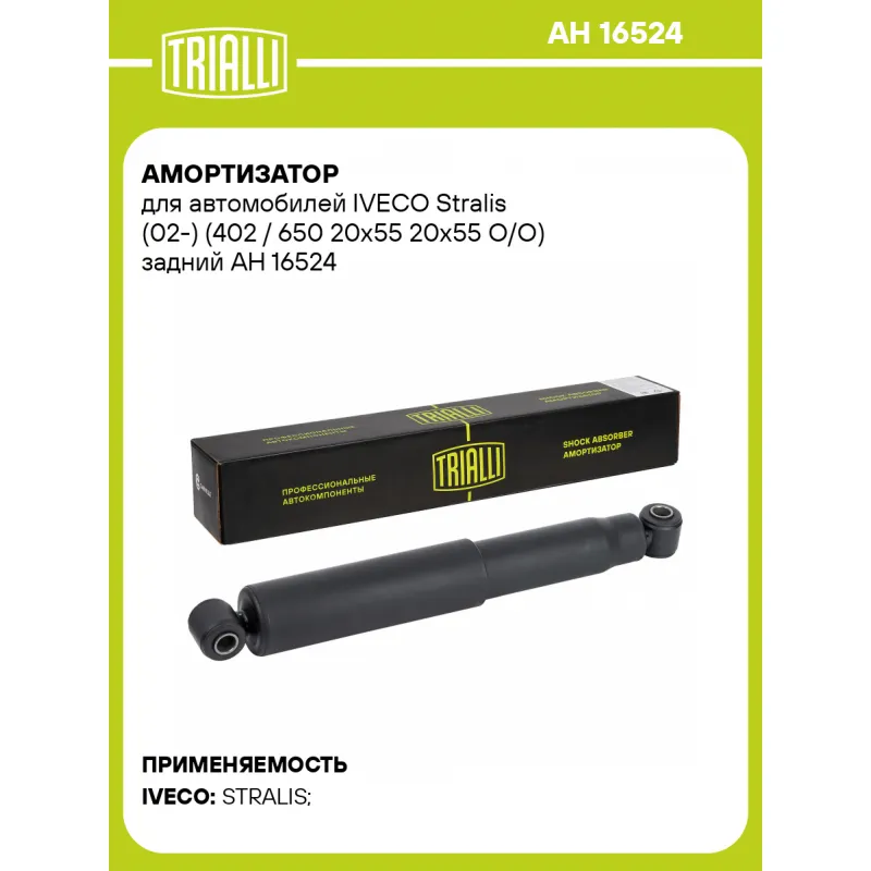 Амортизатор для автомобилей IVECO Stralis (02-) (402 / 650 20x55 20x55 O/O) задний Описание: Амортизатор AH 16524 бренда TRIALLI – это устройство для гашения колебаний (демпфирования) и поглощения толчков и ударов, действующих на раму. Особенности AH 16524: - Вид – Масляный; - Тип – Двухтрубный, гидравлический; Для крепления к деталям кузова или подвески используются крепления: верхнее Проушина/сайлентблок ; и нижнее Проушина/сайлентблок. Совместим с: IVECO STRALIS.Подбор по VIN-номеру вашего автомобиля - через кнопку 'Задать вопрос'. Специалист проверит применяемость и ответит вам. Преимущества: - Инновационная технология производства; - Контроль качества каждой позиции по чертежам и с помощью 3D модели; - Сальник NOK; - Высокоэффективная система проектирования; - Гарантия до двух лет или 60 000 км пробега; Амортизаторы автомобильные существенно влияют на комфорт вождения, сокращая вибрации от неровностей дороги, что делает поездку более плавной и приятной. Регулярное и своевременное обслуживание амортизаторов помогут продлить их срок службы и обеспечить надёжную работу. Характеристики: Артикул: AH 16524 OEM номера: 41225418 Товарная линейка: BLACK Количество на автомобиль: 2 Вид амортизатора: Масляный Тип верхнего крепления: Проушина/сайлентблок Тип нижнего крепления: Проушина/сайлентблок Диаметр корпуса, мм: 65 Диаметр штока, мм: 18 Ход штока, мм: 248 Тип амортизатора: Двухтрубный, гидравлический Ось (сторона установки): Сзади, слева/справа Дополнительная информация: Упаковка изделия может отличаться от представленной на фото Присоединительная длина 2, мм: 650 Присоединительная длина 1, мм: 402 Гарантийный срок: 2 года/60 000 км Комплектация: Амортизатор задний - 1 шт Гарантия: от 1 года.
