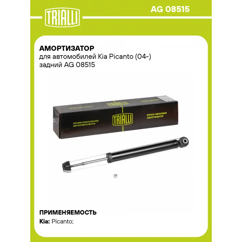 Амортизатор для автомобилей Kia Picanto (04-) задний Описание: Амортизатор AG 08515 бренда TRIALLI – это устройство для гашения колебаний (демпфирования) и поглощения толчков и ударов, действующих на раму. Особенности AG 08515: - Вид – Масляный с газовым подпором низкого давления; - Тип – Двухтрубный, гидравлический; Для крепления к деталям кузова или подвески используются крепления: верхнее Шток M10x1.25; и нижнее Проушина/сайлентблок. Совместим с: KIA PICANTO.Подбор по VIN-номеру вашего автомобиля - через кнопку 'Задать вопрос'. Специалист проверит применяемость и ответит вам. Преимущества: - Инновационная технология производства; - Контроль качества каждой позиции по чертежам и с помощью 3D модели; - Сальник NOK; - Высокоэффективная система проектирования; - Гарантия до двух лет или 60 000 км пробега; Амортизаторы автомобильные существенно влияют на комфорт вождения, сокращая вибрации от неровностей дороги, что делает поездку более плавной и приятной. Регулярное и своевременное обслуживание амортизаторов помогут продлить их срок службы и обеспечить надёжную работу. Характеристики: Артикул: AG 08515 OEM номера: 55310-07100, 55310-07200, 55310-07101, 55310-07201 Товарная линейка: BLACK Количество на автомобиль: 2 Вид амортизатора: Масляный с газовым подпором низкого давления Тип верхнего крепления: Шток Тип нижнего крепления: Проушина/сайлентблок Диаметр корпуса, мм: 38,5 Диаметр штока, мм: 12,5 Ход штока, мм: 203 Размер резьбы штока: M10x1.25 Тип амортизатора: Двухтрубный, гидравлический Ось (сторона установки): Сзади, слева/справа Дополнительная информация: Упаковка изделия может отличаться от представленной на фото Присоединительная длина 2, мм: 563 Сопутствующий товар: Опоры передних стоек: SA 0875; SA 0891 Присоединительная длина 1, мм: 360 Сопутствующий товар: Амортизаторы: AG 08173; AG 08374 Гарантийный срок: 2 года/60 000 км Подходит для авто: Kia Picanto (04-) Для проверки применяемости отправьте VIN автомобиля через вкладку "Есть вопросы о товаре?" Комплектация: Амортизатор задний - 1 шт Гайка крепежная - 1 шт Шарнир резинометаллический - 1 шт Гарантия: от 1 года.