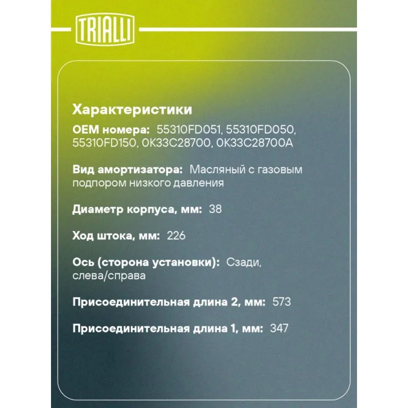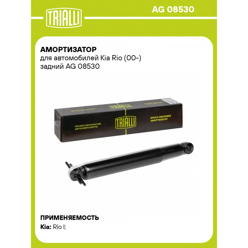 Амортизатор для автомобилей Kia Rio (00-) задний Описание: Амортизатор AG 08530 бренда TRIALLI – это устройство для гашения колебаний (демпфирования) и поглощения толчков и ударов, действующих на раму. Особенности AG 08530: - Вид – Масляный с газовым подпором низкого давления; - Тип – Двухтрубный, гидравлический; Для крепления к деталям кузова или подвески используются крепления: верхнее Проушина/сайлентблок ; и нижнее Проушина/сайлентблок-поперечина. Совместим с: KIA RIO.Подбор по VIN-номеру вашего автомобиля - через кнопку 'Задать вопрос'. Специалист проверит применяемость и ответит вам. Преимущества: - Инновационная технология производства; - Контроль качества каждой позиции по чертежам и с помощью 3D модели; - Сальник NOK; - Высокоэффективная система проектирования; - Гарантия до двух лет или 60 000 км пробега; Амортизаторы автомобильные существенно влияют на комфорт вождения, сокращая вибрации от неровностей дороги, что делает поездку более плавной и приятной. Регулярное и своевременное обслуживание амортизаторов помогут продлить их срок службы и обеспечить надёжную работу. Характеристики: Артикул: AG 08530 OEM номера: 55310FD051, 55310FD050, 55310FD150, 0K33C28700, 0K33C28700A Товарная линейка: BLACK Количество на автомобиль: 2 Вид амортизатора: Масляный с газовым подпором низкого давления Тип верхнего крепления: Проушина/сайлентблок Тип нижнего крепления: Проушина/сайлентблок-поперечина Диаметр корпуса, мм: 38 Диаметр штока, мм: 12,5 Ход штока, мм: 226 Тип амортизатора: Двухтрубный, гидравлический Ось (сторона установки): Сзади, слева/справа Дополнительная информация: Упаковка изделия может отличаться от представленной на фото Присоединительная длина 2, мм: 573 Сопутствующий товар: Опоры передних стоек: SA 0853; SA 0854 Присоединительная длина 1, мм: 347 Сопутствующий товар: Амортизаторы: AG 08187; AG 08388 Гарантийный срок: 2 года/60 000 км Подходит для авто: Kia Rio I (00-) Для проверки применяемости отправьте VIN автомобиля через вкладку "Есть вопросы о товаре?" Комплектация: Амортизатор задний - 1 шт Шарнир резинометаллический - 1 шт Гарантия: от 1 года.
