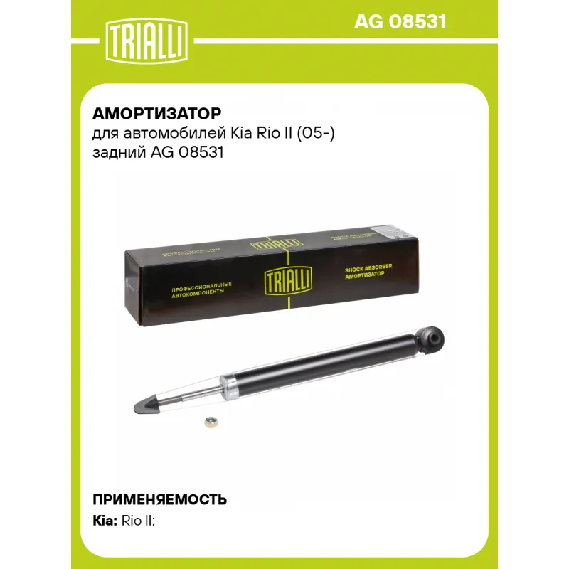Амортизатор для автомобилей Kia Rio II (05-) задний Описание: Амортизатор AG 08531 бренда TRIALLI – это устройство для гашения колебаний (демпфирования) и поглощения толчков и ударов, действующих на раму. Особенности AG 08531: - Вид – Масляный с газовым подпором низкого давления; - Тип – Двухтрубный, гидравлический; Для крепления к деталям кузова или подвески используются крепления: верхнее Шток M10x1.25; и нижнее Проушина/сайлентблок. Совместим с: KIA RIO.Подбор по VIN-номеру вашего автомобиля - через кнопку 'Задать вопрос'. Специалист проверит применяемость и ответит вам. Преимущества: - Инновационная технология производства; - Контроль качества каждой позиции по чертежам и с помощью 3D модели; - Сальник NOK; - Высокоэффективная система проектирования; - Гарантия до двух лет или 60 000 км пробега; Амортизаторы автомобильные существенно влияют на комфорт вождения, сокращая вибрации от неровностей дороги, что делает поездку более плавной и приятной. Регулярное и своевременное обслуживание амортизаторов помогут продлить их срок службы и обеспечить надёжную работу. Характеристики: Артикул: AG 08531 OEM номера: 553101G110, 553101G210, 553101G220 Товарная линейка: BLACK Количество на автомобиль: 2 Вид амортизатора: Масляный с газовым подпором низкого давления Тип верхнего крепления: Шток Тип нижнего крепления: Проушина/сайлентблок Диаметр корпуса, мм: 38 Диаметр штока, мм: 12,5 Ход штока, мм: 224 Размер резьбы штока: M10x1.25 Тип амортизатора: Двухтрубный, гидравлический Ось (сторона установки): Сзади, слева/справа Дополнительная информация: Упаковка изделия может отличаться от представленной на фото Присоединительная длина 2, мм: 600 Сопутствующий товар: Опоры передних стоек: SA 0862; SA 0863; SA 0887; SA 0888 Присоединительная длина 1, мм: 376 Сопутствующий товар: Амортизаторы: AG 08171; AG 08372 Гарантийный срок: 2 года/60 000 км Подходит для авто: Kia Rio II (05-) Для проверки применяемости отправьте VIN автомобиля через вкладку "Есть вопросы о товаре?" Комплектация: Амортизатор задний - 1 шт Шарнир резинометаллический - 1 шт Гайка крепежная - 1 шт Гарантия: от 1 года.