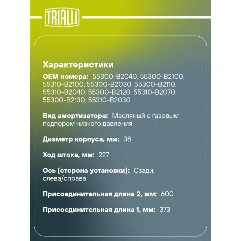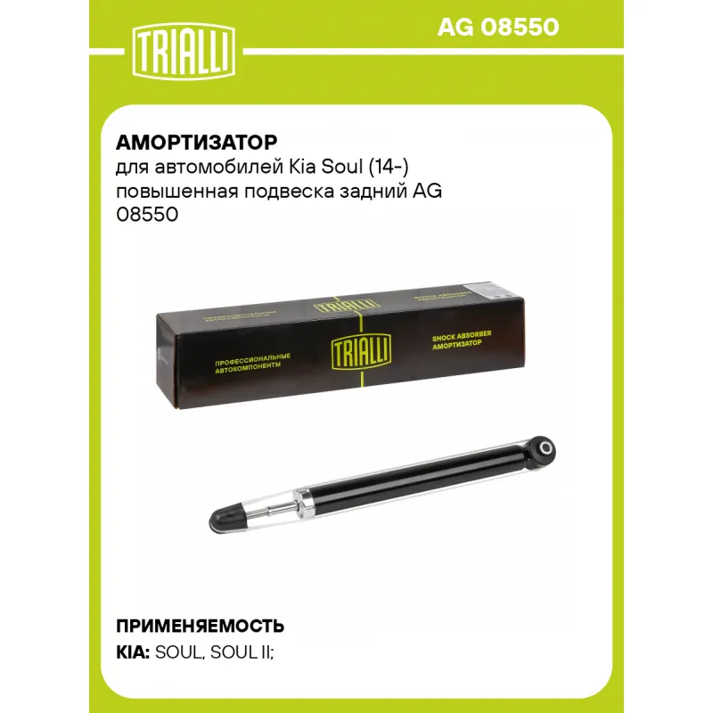 Амортизатор для автомобилей Kia Soul (14-) повышенная подвеска задний Описание: Амортизатор AG 08550 бренда TRIALLI – это устройство для гашения колебаний (демпфирования) и поглощения толчков и ударов, действующих на раму. Особенности AG 08550: - Вид – Масляный с газовым подпором низкого давления; - Тип – Двухтрубный, гидравлический; Для крепления к деталям кузова или подвески используются крепления: верхнее Шток M10x1.25; и нижнее Проушина/сайлентблок. Совместим с: KIA SOUL.Подбор по VIN-номеру вашего автомобиля - через кнопку 'Задать вопрос'. Специалист проверит применяемость и ответит вам. Преимущества: - Инновационная технология производства; - Контроль качества каждой позиции по чертежам и с помощью 3D модели; - Сальник NOK; - Высокоэффективная система проектирования; - Гарантия до двух лет или 60 000 км пробега; Амортизаторы автомобильные существенно влияют на комфорт вождения, сокращая вибрации от неровностей дороги, что делает поездку более плавной и приятной. Регулярное и своевременное обслуживание амортизаторов помогут продлить их срок службы и обеспечить надёжную работу. Характеристики: Артикул: AG 08550 OEM номера: 55300-B2040, 55300-B2100, 55310-B2100, 55300-B2030, 55300-B2110, 55310-B2040, 55300-B2120, 55310-B2070, 55300-B2130, 55310-B2030 Товарная линейка: BLACK Количество на автомобиль: 2 Вид амортизатора: Масляный с газовым подпором низкого давления Тип верхнего крепления: Шток Тип нижнего крепления: Проушина/сайлентблок Диаметр корпуса, мм: 38 Диаметр штока, мм: 12,5 Ход штока, мм: 227 Размер резьбы штока: M10x1.25 Тип амортизатора: Двухтрубный, гидравлический Ось (сторона установки): Сзади, слева/справа Дополнительная информация: Упаковка изделия может отличаться от представленной на фото Присоединительная длина 2, мм: 600 Присоединительная длина 1, мм: 373 Гарантийный срок: 2 года/60 000 км Комплектация: Гайка крепежная - 1 шт Амортизатор задний - 1 шт Гарантия: от 1 года.