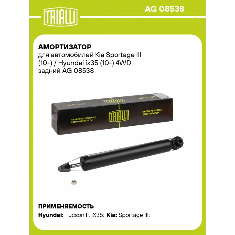 Амортизатор для автомобилей Kia Sportage III (10-) / Hyundai ix35 (10-) 4WD задний Описание: Амортизатор AG 08538 бренда TRIALLI – это устройство для гашения колебаний (демпфирования) и поглощения толчков и ударов, действующих на раму. Особенности AG 08538: - Вид – Масляный с газовым подпором низкого давления; - Тип – Двухтрубный, гидравлический; Для крепления к деталям кузова или подвески используются крепления: верхнее Шток M10x1.25; и нижнее Проушина/сайлентблок. Совместим с: HYUNDAI iX35, ix35, KIA SPORTAGE.Подбор по VIN-номеру вашего автомобиля - через кнопку 'Задать вопрос'. Специалист проверит применяемость и ответит вам. Преимущества: - Инновационная технология производства; - Контроль качества каждой позиции по чертежам и с помощью 3D модели; - Сальник NOK; - Высокоэффективная система проектирования; - Гарантия до двух лет или 60 000 км пробега; Амортизаторы автомобильные существенно влияют на комфорт вождения, сокращая вибрации от неровностей дороги, что делает поездку более плавной и приятной. Регулярное и своевременное обслуживание амортизаторов помогут продлить их срок службы и обеспечить надёжную работу. Характеристики: Артикул: AG 08538 OEM номера: 55311-2S400, 55311-2Y101, 55311-2Y400, 55311-2Y450, 55311-3U100 Товарная линейка: BLACK Количество на автомобиль: 2 Вид амортизатора: Масляный с газовым подпором низкого давления Тип верхнего крепления: Шток Тип нижнего крепления: Проушина/сайлентблок Диаметр корпуса, мм: 45 Диаметр штока, мм: 12,5 Ход штока, мм: 203 Размер резьбы штока: M10x1.25 Тип амортизатора: Двухтрубный, гидравлический Ось (сторона установки): Сзади, слева/справа Дополнительная информация: He для а/м с амортизаторами HPD (High Performance Damping) Присоединительная длина 2, мм: 576 Сопутствующий товар: Опоры передних стоек: SA 0869 Присоединительная длина 1, мм: 373 Сопутствующий товар: Ремонтные комплекты амортизаторов: BCS 2066 Сопутствующий товар: Амортизаторы: AG 08197; AG 08398 Гарантийный срок: 2 года/60 000 км Подходит для авто: Hyundai Tucson II (11-), iX35 (10-) Kia Sportage III (10-) Для проверки применяемости отправьте VIN автомобиля через вкладку "Есть вопросы о товаре?" Комплектация: Амортизатор задний - 1 шт Гайка крепежная - 1 шт Шарнир резинометаллический - 1 шт Гарантия: от 1 года.