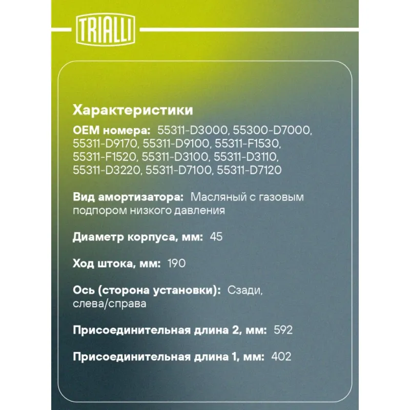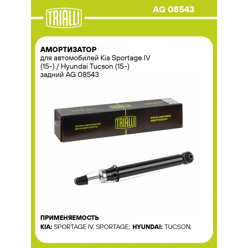 Амортизатор для автомобилей Kia Sportage IV (15-) / Hyundai Tucson (15-) задний Описание: Амортизатор AG 08543 бренда TRIALLI – это устройство для гашения колебаний (демпфирования) и поглощения толчков и ударов, действующих на раму. Особенности AG 08543: - Вид – Масляный с газовым подпором низкого давления; - Тип – Двухтрубный, гидравлический; Для крепления к деталям кузова или подвески используются крепления: верхнее Шток M10x1.25; и нижнее Проушина/сайлентблок. Совместим с: HYUNDAI TUCSON, KIA SPORTAGE.Подбор по VIN-номеру вашего автомобиля - через кнопку 'Задать вопрос'. Специалист проверит применяемость и ответит вам. Преимущества: - Инновационная технология производства; - Контроль качества каждой позиции по чертежам и с помощью 3D модели; - Сальник NOK; - Высокоэффективная система проектирования; - Гарантия до двух лет или 60 000 км пробега; Амортизаторы автомобильные существенно влияют на комфорт вождения, сокращая вибрации от неровностей дороги, что делает поездку более плавной и приятной. Регулярное и своевременное обслуживание амортизаторов помогут продлить их срок службы и обеспечить надёжную работу. Характеристики: Артикул: AG 08543 OEM номера: 55311-D3000, 55300-D7000, 55311-D9170, 55311-D9100, 55311-F1530, 55311-F1520, 55311-D3100, 55311-D3110, 55311-D3220, 55311-D7100, 55311-D7120, 55311-D7530, 55300-D7530, 55300-D7510 Товарная линейка: BLACK Количество на автомобиль: 2 Вид амортизатора: Масляный с газовым подпором низкого давления Тип верхнего крепления: Шток Тип нижнего крепления: Проушина/сайлентблок Диаметр корпуса, мм: 45 Диаметр штока, мм: 12,5 Ход штока, мм: 190 Размер резьбы штока: M10x1.25 Тип амортизатора: Двухтрубный, гидравлический Ось (сторона установки): Сзади, слева/справа Дополнительная информация: Не для а/м с H.P.D. амортизаторами Присоединительная длина 2, мм: 592 Присоединительная длина 1, мм: 402 Гарантийный срок: 2 года/60 000 км Комплектация: Амортизатор задний - 1 шт Гайка крепежная - 1 шт Гарантия: от 1 года.