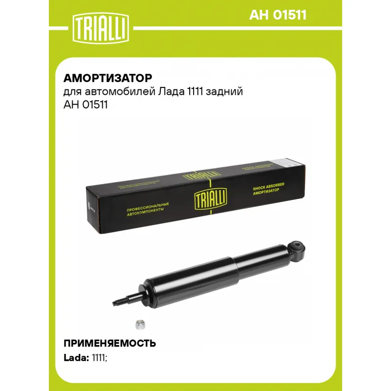 Амортизатор для автомобилей Лада 1111 задний Описание: Амортизатор AH 01511 бренда TRIALLI – это устройство для гашения колебаний (демпфирования) и поглощения толчков и ударов, действующих на раму. Особенности AH 01511: - Вид – Масляный; - Тип – Двухтрубный, гидравлический; Для крепления к деталям кузова или подвески используются крепления: верхнее Шток M10x1.25; и нижнее Проушина/сайлентблок. Совместим с: LADA OKA.Подбор по VIN-номеру вашего автомобиля - через кнопку 'Задать вопрос'. Специалист проверит применяемость и ответит вам. Преимущества: - Инновационная технология производства; - Контроль качества каждой позиции по чертежам и с помощью 3D модели; - Сальник NOK; - Высокоэффективная система проектирования; - Гарантия до двух лет или 60 000 км пробега; Амортизаторы автомобильные существенно влияют на комфорт вождения, сокращая вибрации от неровностей дороги, что делает поездку более плавной и приятной. Регулярное и своевременное обслуживание амортизаторов помогут продлить их срок службы и обеспечить надёжную работу. Характеристики: Артикул: AH 01511 OEM номера: 1111-2915006, 11110-2915006-00, 11110-2915402-00, 11110-2915402-82 Товарная линейка: BLACK Количество на автомобиль: 2 Вид амортизатора: Масляный Тип верхнего крепления: Шток Тип нижнего крепления: Проушина/сайлентблок Диаметр корпуса, мм: 41 Диаметр штока, мм: 12,5 Ход штока, мм: 140 Размер резьбы штока: M10x1.25 Тип амортизатора: Двухтрубный, гидравлический Ось (сторона установки): Сзади, слева/справа Дополнительная информация: Упаковка изделия может отличаться от представленной на фото Присоединительная длина 2, мм: 385 Присоединительная длина 1, мм: 245 Сопутствующий товар: Амортизаторы: AG 01001,AH 01050 Гарантийный срок: 2 года/60 000 км Подходит для авто: ВАЗ 1111 (Ока) Для проверки применяемости отправьте VIN автомобиля через вкладку "Есть вопросы о товаре?" Комплектация: Амортизатор задний - 1 шт Шарнир резинометаллический - 1 шт Гайка крепежная - 1 шт Гарантия: от 1 года.