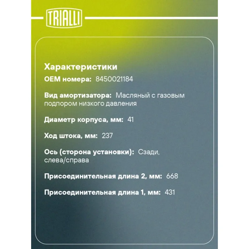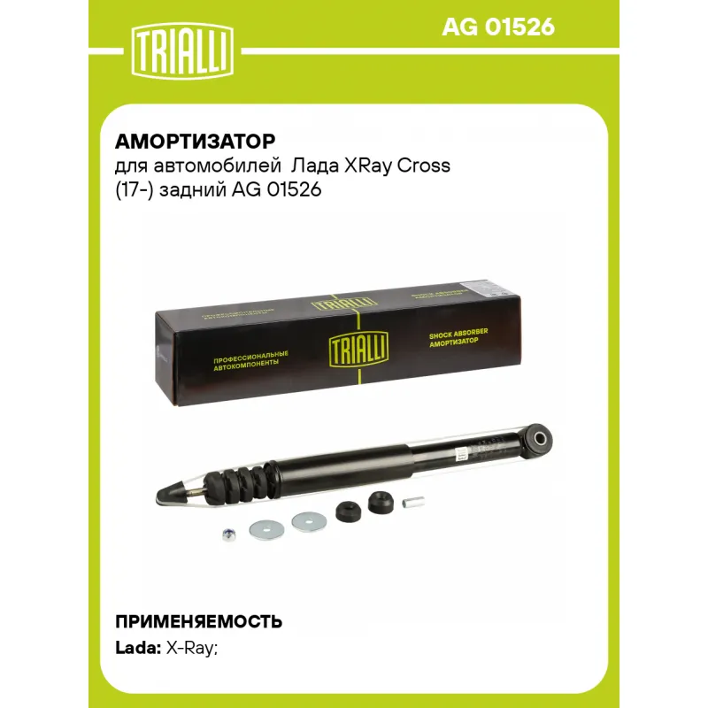 Амортизатор для автомобилей Лада XRay Cross (17-) задний Описание: Амортизатор AG 01526 бренда TRIALLI – это устройство для гашения колебаний (демпфирования) и поглощения толчков и ударов, действующих на раму. Особенности AG 01526: - Вид – Масляный с газовым подпором низкого давления; - Тип – Двухтрубный, гидравлический; Для крепления к деталям кузова или подвески используются крепления: верхнее Шток M04x1; и нижнее Проушина/сайлентблок. Совместим с: LADA XRAY.Подбор по VIN-номеру вашего автомобиля - через кнопку 'Задать вопрос'. Специалист проверит применяемость и ответит вам. Преимущества: - Инновационная технология производства; - Контроль качества каждой позиции по чертежам и с помощью 3D модели; - Сальник NOK; - Высокоэффективная система проектирования; - Гарантия до двух лет или 60 000 км пробега; Амортизаторы автомобильные существенно влияют на комфорт вождения, сокращая вибрации от неровностей дороги, что делает поездку более плавной и приятной. Регулярное и своевременное обслуживание амортизаторов помогут продлить их срок службы и обеспечить надёжную работу. Характеристики: Артикул: AG 01526 OEM номера: 8450021184 Товарная линейка: BLACK Количество на автомобиль: 2 Вид амортизатора: Масляный с газовым подпором низкого давления Тип верхнего крепления: Шток Тип нижнего крепления: Проушина/сайлентблок Диаметр корпуса, мм: 41 Диаметр штока, мм: 12,5 Ход штока, мм: 237 Размер резьбы штока: M04x1 Тип амортизатора: Двухтрубный, гидравлический Ось (сторона установки): Сзади, слева/справа Дополнительная информация: Упаковка изделия может отличаться от представленной на фото Присоединительная длина 2, мм: 668 Присоединительная длина 1, мм: 431 Гарантийный срок: 2 года/60 000 км Подходит для авто: ВАЗ X-Ray (15-) Для проверки применяемости отправьте VIN автомобиля через вкладку "Есть вопросы о товаре?" Комплектация: Гайка крепежная - 1 шт Амортизатор задний - 1 шт Шайба - 2 шт Втулка распорная - 1 шт Подушка резиновая - 2 шт Отбойник из термоэластопласта - 1 шт Кожух пылезащитный - 1 шт Гарантия: от 1 года.
