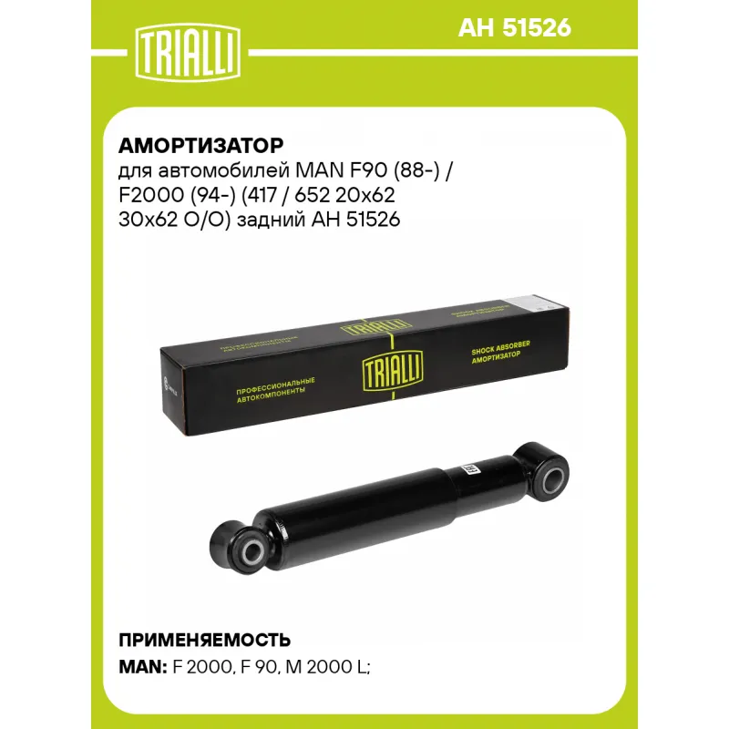 Амортизатор для автомобилей MAN F90 (88-) / F2000 (94-) (417 / 652 20x62 30x62 O/O) задний Описание: Амортизатор AH 51526 бренда TRIALLI – это устройство для гашения колебаний (демпфирования) и поглощения толчков и ударов, действующих на раму. Особенности AH 51526: - Вид – Масляный; - Тип – Двухтрубный, гидравлический; Для крепления к деталям кузова или подвески используются крепления: верхнее Проушина/сайлентблок ; и нижнее Проушина/сайлентблок. Совместим с: MAN F2000, F90, M2000.Подбор по VIN-номеру вашего автомобиля - через кнопку 'Задать вопрос'. Специалист проверит применяемость и ответит вам. Преимущества: - Инновационная технология производства; - Контроль качества каждой позиции по чертежам и с помощью 3D модели; - Сальник NOK; - Высокоэффективная система проектирования; - Гарантия до двух лет или 60 000 км пробега; Амортизаторы автомобильные существенно влияют на комфорт вождения, сокращая вибрации от неровностей дороги, что делает поездку более плавной и приятной. Регулярное и своевременное обслуживание амортизаторов помогут продлить их срок службы и обеспечить надёжную работу. Характеристики: Артикул: AH 51526 OEM номера: 81.43701-6710, 81.43701-6711, 81.43701-6827, 81.43702-6131 Товарная линейка: BLACK Количество на автомобиль: 2 Вид амортизатора: Масляный Тип верхнего крепления: Проушина/сайлентблок Тип нижнего крепления: Проушина/сайлентблок Диаметр корпуса, мм: 63.5 Диаметр штока, мм: 20 Ход штока, мм: 235 Тип амортизатора: Двухтрубный, гидравлический Ось (сторона установки): Сзади, слева/справа Присоединительная длина 2, мм: 651 Присоединительная длина 1, мм: 416 Гарантийный срок: 2 года/60 000 км Комплектация: Амортизатор задний - 1 шт Шарнир резинометаллический - 2 шт Гарантия: от 1 года.