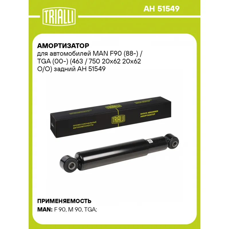 Амортизатор для автомобилей MAN F90 (88-) / TGA (00-) (463 / 750 20x62 20x62 O/O) задний Описание: Амортизатор AH 51549 бренда TRIALLI – это устройство для гашения колебаний (демпфирования) и поглощения толчков и ударов, действующих на раму. Особенности AH 51549: - Вид – Масляный; - Тип – Двухтрубный, гидравлический; Для крепления к деталям кузова или подвески используются крепления: верхнее Проушина/сайлентблок ; и нижнее Проушина/сайлентблок. Совместим с: MAN F90, M90, TGA.Подбор по VIN-номеру вашего автомобиля - через кнопку 'Задать вопрос'. Специалист проверит применяемость и ответит вам. Преимущества: - Инновационная технология производства; - Контроль качества каждой позиции по чертежам и с помощью 3D модели; - Сальник NOK; - Высокоэффективная система проектирования; - Гарантия до двух лет или 60 000 км пробега; Амортизаторы автомобильные существенно влияют на комфорт вождения, сокращая вибрации от неровностей дороги, что делает поездку более плавной и приятной. Регулярное и своевременное обслуживание амортизаторов помогут продлить их срок службы и обеспечить надёжную работу. Характеристики: Артикул: AH 51549 OEM номера: 81.43701-6568, 81.43701-6605 Товарная линейка: BLACK Количество на автомобиль: 2 Вид амортизатора: Масляный Тип верхнего крепления: Проушина/сайлентблок Тип нижнего крепления: Проушина/сайлентблок Диаметр корпуса, мм: 63,5 Диаметр штока, мм: 20 Ход штока, мм: 286 Тип амортизатора: Двухтрубный, гидравлический Ось (сторона установки): Сзади, слева/справа Присоединительная длина 2, мм: 750 Присоединительная длина 1, мм: 464 Гарантийный срок: 2 года/60 000 км Комплектация: Амортизатор задний - 1 шт Шарнир резинометаллический - 2 шт Гарантия: от 1 года.