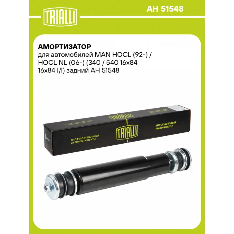 Амортизатор для автомобилей MAN HOCL (92-) / HOCL NL (06-) (340 / 540 16x84 16x84 I/I) задний Описание: Амортизатор AH 51548 бренда TRIALLI – это устройство для гашения колебаний (демпфирования) и поглощения толчков и ударов, действующих на раму. Особенности AH 51548: - Вид – Масляный; - Тип – Двухтрубный, гидравлический; Для крепления к деталям кузова или подвески используются крепления: верхнее Шток M16x1,5; и нижнее Корпус. Совместим с: автомобилей MAN HOCL (92-)Подбор по VIN-номеру вашего автомобиля - через кнопку 'Задать вопрос'. Специалист проверит применяемость и ответит вам. Преимущества: - Инновационная технология производства; - Контроль качества каждой позиции по чертежам и с помощью 3D модели; - Сальник NOK; - Высокоэффективная система проектирования; - Гарантия до двух лет или 60 000 км пробега; Амортизаторы автомобильные существенно влияют на комфорт вождения, сокращая вибрации от неровностей дороги, что делает поездку более плавной и приятной. Регулярное и своевременное обслуживание амортизаторов помогут продлить их срок службы и обеспечить надёжную работу. Характеристики: Артикул: AH 51548 OEM номера: 81.43701-6900, 81.43701-6767 Товарная линейка: BLACK Количество на автомобиль: 2 Вид амортизатора: Масляный Тип верхнего крепления: Шток Тип нижнего крепления: Корпус Диаметр корпуса, мм: 65 Диаметр штока, мм: 20 Ход штока, мм: 209 Размер резьбы штока: M16x1,5 Тип амортизатора: Двухтрубный, гидравлический Ось (сторона установки): Сзади, слева/справа Дополнительная информация: Упаковка изделия может отличаться от представленной на фото Присоединительная длина 2, мм: 535 Присоединительная длина 1, мм: 326 Гарантийный срок: 2 года/60 000 км Комплектация: Амортизатор задний - 1 шт Втулка резиновая - 4 шт Шайба - 6 шт Гайка крепежная - 2 шт Втулка дистанционная - 1 шт Гарантия: от 1 года.