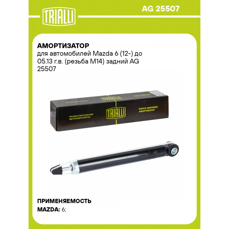 Амортизатор для автомобилей Mazda 6 (12-) до 05.13 г.в. (резьба М14) задний Описание: Амортизатор AG 25507 бренда TRIALLI – это устройство для гашения колебаний (демпфирования) и поглощения толчков и ударов, действующих на раму. Особенности AG 25507: - Вид – Масляный с газовым подпором низкого давления; - Тип – Двухтрубный, гидравлический; Для крепления к деталям кузова или подвески используются крепления: верхнее Шток M8x1,25; и нижнее Проушина/сайлентблок. Совместим с: MAZDA 6.Подбор по VIN-номеру вашего автомобиля - через кнопку 'Задать вопрос'. Специалист проверит применяемость и ответит вам. Преимущества: - Инновационная технология производства; - Контроль качества каждой позиции по чертежам и с помощью 3D модели; - Сальник NOK; - Высокоэффективная система проектирования; - Гарантия до двух лет или 60 000 км пробега; Амортизаторы автомобильные существенно влияют на комфорт вождения, сокращая вибрации от неровностей дороги, что делает поездку более плавной и приятной. Регулярное и своевременное обслуживание амортизаторов помогут продлить их срок службы и обеспечить надёжную работу. Характеристики: Артикул: AG 25507 OEM номера: GHK528700A, GHK5-28-910D, GJY928700 Товарная линейка: BLACK Количество на автомобиль: 2 Вид амортизатора: Масляный с газовым подпором низкого давления Тип верхнего крепления: Шток Тип нижнего крепления: Проушина/сайлентблок Диаметр корпуса, мм: 45 Диаметр штока, мм: 15 Ход штока, мм: 244 Размер резьбы штока: M8x1,25 Тип амортизатора: Двухтрубный, гидравлический Ось (сторона установки): Сзади, слева/справа Дополнительная информация: Для а/м до 05.2013 г.в. Присоединительная длина 2, мм: 646 Присоединительная длина 1, мм: 402 Гарантийный срок: 2 года/60 000 км Комплектация: Гайка крепежная - 1 шт Амортизатор задний - 1 шт Гарантия: от 1 года.
