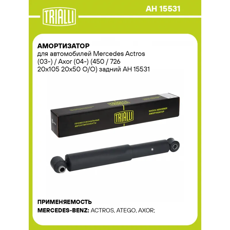 Амортизатор для автомобилей Mercedes Actros (03-) / Axor (04-) (450 / 726 20x105 20x50 O/O) задний Описание: Амортизатор AH 15531 бренда TRIALLI – это устройство для гашения колебаний (демпфирования) и поглощения толчков и ударов, действующих на раму. Особенности AH 15531: - Вид – Масляный; - Тип – Двухтрубный, гидравлический; Для крепления к деталям кузова или подвески используются крепления: верхнее Проушина/сайлентблок ; и нижнее Проушина/сайлентблок. Совместим с: MERCEDES-BENZ ACTROS, ATEGO, AXOR, ECONIC.Подбор по VIN-номеру вашего автомобиля - через кнопку 'Задать вопрос'. Специалист проверит применяемость и ответит вам. Преимущества: - Инновационная технология производства; - Контроль качества каждой позиции по чертежам и с помощью 3D модели; - Сальник NOK; - Высокоэффективная система проектирования; - Гарантия до двух лет или 60 000 км пробега; Амортизаторы автомобильные существенно влияют на комфорт вождения, сокращая вибрации от неровностей дороги, что делает поездку более плавной и приятной. Регулярное и своевременное обслуживание амортизаторов помогут продлить их срок службы и обеспечить надёжную работу. Характеристики: Артикул: AH 15531 OEM номера: A 005 326 25 00, A 006 326 60 00, 005 326 25 00, 006 326 60 00, 53262500, 63266000 Товарная линейка: BLACK Количество на автомобиль: 2 Вид амортизатора: Масляный Тип верхнего крепления: Проушина/сайлентблок Тип нижнего крепления: Проушина/сайлентблок Диаметр корпуса, мм: 63.4 Диаметр штока, мм: 20 Ход штока, мм: 276 Тип амортизатора: Двухтрубный, гидравлический Ось (сторона установки): Сзади, слева/справа Дополнительная информация: Упаковка изделия может отличаться от представленной на фото Присоединительная длина 2, мм: 726 Присоединительная длина 1, мм: 450 Гарантийный срок: 2 года/60 000 км Комплектация: Амортизатор задний - 1 шт Гарантия: от 1 года.