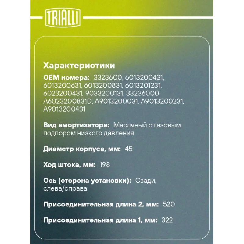 Амортизатор для автомобилей Mercedes Sprinter Classic (13-) / Sprinter (95-) до 1,6т задний Описание: Амортизатор AG 15501 бренда TRIALLI – это устройство для гашения колебаний (демпфирования) и поглощения толчков и ударов, действующих на раму. Особенности AG 15501: - Вид – Масляный с газовым подпором низкого давления; - Тип – Двухтрубный, гидравлический; Для крепления к деталям кузова или подвески используются крепления: верхнее Проушина/сайлентблок ; и нижнее Проушина/сайлентблок. Совместим с: FIAT UNO, MERCEDES-BENZ SPRINTER, VW LT.Подбор по VIN-номеру вашего автомобиля - через кнопку 'Задать вопрос'. Специалист проверит применяемость и ответит вам. Преимущества: - Инновационная технология производства; - Контроль качества каждой позиции по чертежам и с помощью 3D модели; - Сальник NOK; - Высокоэффективная система проектирования; - Гарантия до двух лет или 60 000 км пробега; Амортизаторы автомобильные существенно влияют на комфорт вождения, сокращая вибрации от неровностей дороги, что делает поездку более плавной и приятной. Регулярное и своевременное обслуживание амортизаторов помогут продлить их срок службы и обеспечить надёжную работу. Характеристики: Артикул: AG 15501 OEM номера: 3323600, 6013200431, 6013200631, 6013200831, 6013201231, 6023200431, 9033200131, 33236000, A6023200831D, A9013200031, A9013200231, A9013200431, A9033200031, 0033236000, A9033200131, A6013200431, A6013200631, A6013200831, A6023200431, A6023200631, A6013201231, A6023201231, A6023201331, A6023201431, A9013200631, A9013200731, 9013200231, 9013200431, 9013200631, 9013200731, 9033200031, A0033236000, 6023200631, 6023200831D, 6023201231, 6023201331, 6023201431, 9013200031, 2D0513029, 2D0513029A, 2D0513029B, 2D0513029E, 2D0513029F, 2D0513029G, 2D0513029Q Товарная линейка: BLACK Количество на автомобиль: 2 Вид амортизатора: Масляный с газовым подпором низкого давления Тип верхнего крепления: Проушина/сайлентблок Тип нижнего крепления: Проушина/сайлентблок Диаметр корпуса, мм: 38 Диаметр штока, мм: 14 Ход штока, мм: 196 Тип амортизатора: Двухтрубный, гидравлический Ось (сторона установки): Сзади, слева/справа Дополнительная информация: Для а/м грузоподъёмностью до 1600 кг (MB серии 2ххD и 3ххD, VW LT28 и LT 35) Присоединительная длина 2, мм: 517 Присоединительная длина 1, мм: 321 Сопутствующий товар: Амортизаторы: AG 15051; AG 15052; AH 15502 Гарантийный срок: 2 года/60 000 км Подходит для авто: Mercedes-Benz Sprinter (95-), Sprinter (00-), Sprinter Classic (13-) Volkswagen LT (96-) Для проверки применяемости отправьте VIN автомобиля через вкладку "Есть вопросы о товаре?" Комплектация: Амортизатор задний - 1 шт Шарнир резинометаллический - 2 шт Гарантия: от 1 года.