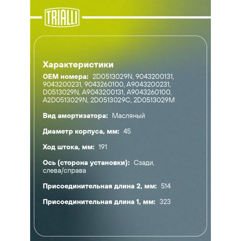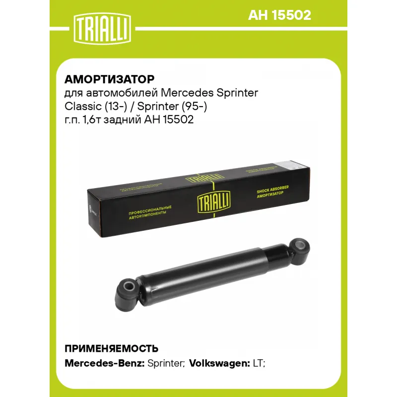 Амортизатор для автомобилей Mercedes Sprinter Classic (13-) / Sprinter (95-) г.п. 1,6т задний Описание: Амортизатор AH 15502 бренда TRIALLI – это устройство для гашения колебаний (демпфирования) и поглощения толчков и ударов, действующих на раму. Особенности AH 15502: - Вид – Масляный; - Тип – Двухтрубный, гидравлический; Для крепления к деталям кузова или подвески используются крепления: верхнее Проушина/сайлентблок ; и нижнее Проушина/сайлентблок. Совместим с: MERCEDES-BENZ SPRINTER, VW LT.Подбор по VIN-номеру вашего автомобиля - через кнопку 'Задать вопрос'. Специалист проверит применяемость и ответит вам. Преимущества: - Инновационная технология производства; - Контроль качества каждой позиции по чертежам и с помощью 3D модели; - Сальник NOK; - Высокоэффективная система проектирования; - Гарантия до двух лет или 60 000 км пробега; Амортизаторы автомобильные существенно влияют на комфорт вождения, сокращая вибрации от неровностей дороги, что делает поездку более плавной и приятной. Регулярное и своевременное обслуживание амортизаторов помогут продлить их срок службы и обеспечить надёжную работу. Характеристики: Артикул: AH 15502 OEM номера: 2D0513029N, 9043200131, 9043200231, 9043260100, A9043200231, D0513029N, A9043200131, A9043260100, A2D0513029N, 2D0513029C, 2D0513029M Товарная линейка: BLACK Количество на автомобиль: 2 Вид амортизатора: Масляный Тип верхнего крепления: Проушина/сайлентблок Тип нижнего крепления: Проушина/сайлентблок Диаметр корпуса, мм: 45 Диаметр штока, мм: 14 Ход штока, мм: 191 Тип амортизатора: Двухтрубный, гидравлический Ось (сторона установки): Сзади, слева/справа Дополнительная информация: Для а/м грузоподъёмностью более 1600 кг (MB серии 4ххD, VW LT46) Присоединительная длина 2, мм: 514 Присоединительная длина 1, мм: 323 Сопутствующий товар: Амортизаторы: AG 15051; AG 15052; AG 15501 Гарантийный срок: 2 года/60 000 км Подходит для авто: Mercedes-Benz Sprinter (95-), Sprinter (00-), Sprinter Classic (13-) Volkswagen LT (96-) Для проверки применяемости отправьте VIN автомобиля через вкладку "Есть вопросы о товаре?" Комплектация: Амортизатор задний - 1 шт Шарнир резинометаллический - 1 шт Гарантия: от 1 года.
