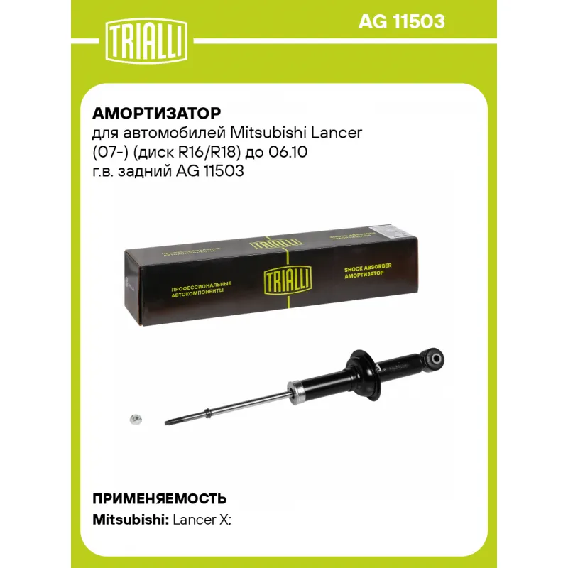 Амортизатор для автомобилей Mitsubishi Lancer (07-) (диск R16/R18) до 06.10 г.в. задний Описание: Амортизатор AG 11503 бренда TRIALLI – это устройство для гашения колебаний (демпфирования) и поглощения толчков и ударов, действующих на раму. Особенности AG 11503: - Вид – Масляный с газовым подпором низкого давления; - Тип – Двухтрубный, гидравлический; Для крепления к деталям кузова или подвески используются крепления: верхнее Шток M10x1.25; и нижнее Проушина/сайлентблок. Совместим с: MITSUBISHI LANCER.Подбор по VIN-номеру вашего автомобиля - через кнопку 'Задать вопрос'. Специалист проверит применяемость и ответит вам. Преимущества: - Инновационная технология производства; - Контроль качества каждой позиции по чертежам и с помощью 3D модели; - Сальник NOK; - Высокоэффективная система проектирования; - Гарантия до двух лет или 60 000 км пробега; Амортизаторы автомобильные существенно влияют на комфорт вождения, сокращая вибрации от неровностей дороги, что делает поездку более плавной и приятной. Регулярное и своевременное обслуживание амортизаторов помогут продлить их срок службы и обеспечить надёжную работу. Характеристики: Артикул: AG 11503 OEM номера: 4162A130, 341455 Товарная линейка: BLACK Количество на автомобиль: 2 Вид амортизатора: Масляный с газовым подпором низкого давления Тип верхнего крепления: Шток Тип нижнего крепления: Проушина/сайлентблок Диаметр корпуса, мм: 38,5 Диаметр штока, мм: 12,5 Ход штока, мм: 159 Размер резьбы штока: M10x1.25 Тип амортизатора: Двухтрубный, гидравлический Ось (сторона установки): Сзади, слева/справа Дополнительная информация: Упаковка изделия может отличаться от представленной на фото Присоединительная длина 2, мм: 457 Сопутствующий товар: Опоры передних стоек: SA 1151; SA 1153 Присоединительная длина 1, мм: 298 Сопутствующий товар: Амортизаторы: AG 11153; AG 11354 Гарантийный срок: 2 года/60 000 км Подходит для авто: Mitsubishi Lancer X (07-) Для проверки применяемости отправьте VIN автомобиля через вкладку "Есть вопросы о товаре?" Комплектация: Амортизатор задний - 1 шт Гайка крепежная - 1 шт Шарнир резинометаллический - 1 шт Гарантия: от 1 года.