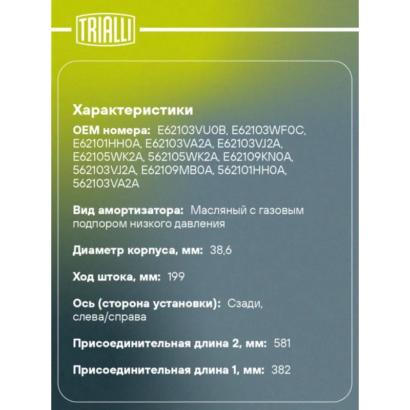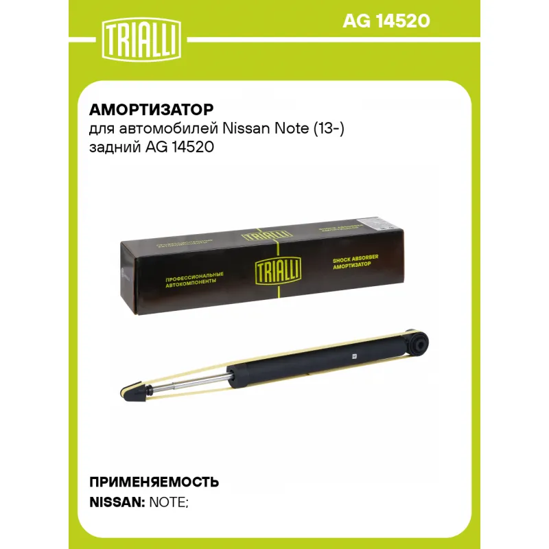Амортизатор для автомобилей Nissan Note (13-) задний Описание: Амортизатор AG 14520 бренда TRIALLI – это устройство для гашения колебаний (демпфирования) и поглощения толчков и ударов, действующих на раму. Особенности AG 14520: - Вид – Масляный с газовым подпором низкого давления; - Тип – Двухтрубный, гидравлический; Для крепления к деталям кузова или подвески используются крепления: верхнее Шток M10x1,25; и нижнее Проушина/сайлентблок. Совместим с: NISSAN NOTE.Подбор по VIN-номеру вашего автомобиля - через кнопку 'Задать вопрос'. Специалист проверит применяемость и ответит вам. Преимущества: - Инновационная технология производства; - Контроль качества каждой позиции по чертежам и с помощью 3D модели; - Сальник NOK; - Высокоэффективная система проектирования; - Гарантия до двух лет или 60 000 км пробега; Амортизаторы автомобильные существенно влияют на комфорт вождения, сокращая вибрации от неровностей дороги, что делает поездку более плавной и приятной. Регулярное и своевременное обслуживание амортизаторов помогут продлить их срок службы и обеспечить надёжную работу. Характеристики: Артикул: AG 14520 OEM номера: E62103VU0B, E62103WF0C, E62101HH0A, E62103VA2A, E62103VJ2A, E62105WK2A, 562105WK2A, E62109KN0A, 562103VJ2A, E62109MB0A, 562101HH0A, 562103VA2A, 562103VU0B, 562103WF0C, 562109MB0A Товарная линейка: BLACK Количество на автомобиль: 2 Вид амортизатора: Масляный с газовым подпором низкого давления Тип верхнего крепления: Шток Тип нижнего крепления: Проушина/сайлентблок Диаметр корпуса, мм: 38.6 Диаметр штока, мм: 12.5 Ход штока, мм: 199 Размер резьбы штока: M10x1,25 Тип амортизатора: Двухтрубный, гидравлический Ось (сторона установки): Сзади, слева/справа Дополнительная информация: Упаковка изделия может отличаться от представленной на фото Присоединительная длина 2, мм: 581 Присоединительная длина 1, мм: 382 Сопутствующий товар: Амортизаторы: AG 14187, AG 14388 Гарантийный срок: 2 года/60 000 км Комплектация: Амортизатор задний - 1 шт Гайка крепежная - 1 шт Гарантия: от 1 года.