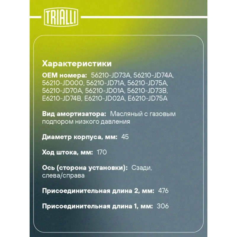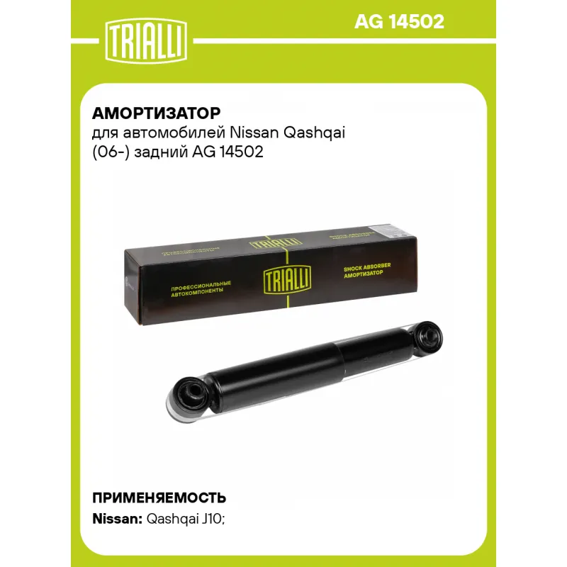 Амортизатор для автомобилей Nissan Qashqai (06-) задний Описание: Амортизатор AG 14502 бренда TRIALLI – это устройство для гашения колебаний (демпфирования) и поглощения толчков и ударов, действующих на раму. Особенности AG 14502: - Вид – Масляный с газовым подпором низкого давления; - Тип – Двухтрубный, гидравлический; Для крепления к деталям кузова или подвески используются крепления: верхнее Проушина/сайлентблок ; и нижнее Проушина/сайлентблок. Совместим с: NISSAN QASHQAI.Подбор по VIN-номеру вашего автомобиля - через кнопку 'Задать вопрос'. Специалист проверит применяемость и ответит вам. Преимущества: - Инновационная технология производства; - Контроль качества каждой позиции по чертежам и с помощью 3D модели; - Сальник NOK; - Высокоэффективная система проектирования; - Гарантия до двух лет или 60 000 км пробега; Амортизаторы автомобильные существенно влияют на комфорт вождения, сокращая вибрации от неровностей дороги, что делает поездку более плавной и приятной. Регулярное и своевременное обслуживание амортизаторов помогут продлить их срок службы и обеспечить надёжную работу. Характеристики: Артикул: AG 14502 OEM номера: 56210-JD73A, 56210-JD74A, 56210-JD000, 56210-JD71A, 56210-JD75A, 56210-JD70A, 56210-JD01A, 56210-JD73B, E6210-JD74B, E6210-JD02A, E6210-JD75A, E6210-JD73A, 56210-JD74B, E6210-JE21B, E6210-JD74A, 56210-JD370A, 56210-JD02A, 56210-JD00B, 56210-JD72A, 56210-JD00A, E6210JD04A, 562104837R, 56210BR05A Товарная линейка: BLACK Количество на автомобиль: 2 Вид амортизатора: Масляный с газовым подпором низкого давления Тип верхнего крепления: Проушина/сайлентблок Тип нижнего крепления: Проушина/сайлентблок Диаметр корпуса, мм: 45 Диаметр штока, мм: 12,5 Ход штока, мм: 170 Тип амортизатора: Двухтрубный, гидравлический Ось (сторона установки): Сзади, слева/справа Дополнительная информация: Упаковка изделия может отличаться от представленной на фото Присоединительная длина 2, мм: 476 Присоединительная длина 1, мм: 306 Сопутствующий товар: Амортизаторы: AG 14152; AG 14353 Гарантийный срок: 2 года/60 000 км Подходит для авто: Nissan Qashqai J10 (06-), Qashqai J10 (06-) Для проверки применяемости отправьте VIN автомобиля через вкладку "Есть вопросы о товаре?" Комплектация: Амортизатор задний - 1 шт Шарнир резинометаллический - 2 шт Гарантия: от 1 года.