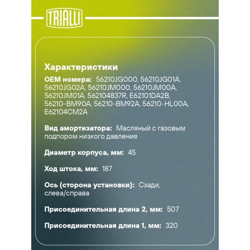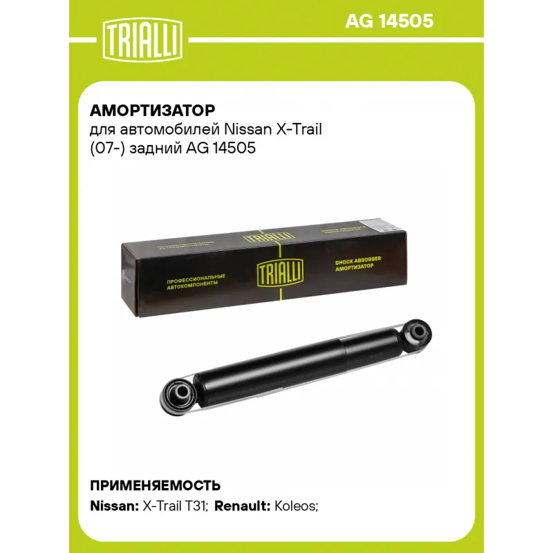 Амортизатор для автомобилей Nissan X-Trail (07-) задний Описание: Амортизатор AG 14505 бренда TRIALLI – это устройство для гашения колебаний (демпфирования) и поглощения толчков и ударов, действующих на раму. Особенности AG 14505: - Вид – Масляный с газовым подпором низкого давления; - Тип – Двухтрубный, гидравлический; Для крепления к деталям кузова или подвески используются крепления: верхнее Проушина/сайлентблок ; и нижнее Проушина/сайлентблок. Совместим с: NISSAN X-TRAIL, QASHQAI, RENAULT KOLEOS.Подбор по VIN-номеру вашего автомобиля - через кнопку 'Задать вопрос'. Специалист проверит применяемость и ответит вам. Преимущества: - Инновационная технология производства; - Контроль качества каждой позиции по чертежам и с помощью 3D модели; - Сальник NOK; - Высокоэффективная система проектирования; - Гарантия до двух лет или 60 000 км пробега; Амортизаторы автомобильные существенно влияют на комфорт вождения, сокращая вибрации от неровностей дороги, что делает поездку более плавной и приятной. Регулярное и своевременное обслуживание амортизаторов помогут продлить их срок службы и обеспечить надёжную работу. Характеристики: Артикул: AG 14505 OEM номера: 56210JG000, 56210JG01A, 56210JG02A, 56210JM000, 56210JM00A, 56210JM01A, 562104837R, E62101DA2B, 56210-BM90A, 56210-BM92A, 56210-HL00A, E62104CM2A, 56210JY00A, 56210JY01A, 56210JY01B, E62101DA1B, E6210JG01A, E6B10JG01A Товарная линейка: BLACK Количество на автомобиль: 2 Вид амортизатора: Масляный с газовым подпором низкого давления Тип верхнего крепления: Проушина/сайлентблок Тип нижнего крепления: Проушина/сайлентблок Диаметр корпуса, мм: 45 Диаметр штока, мм: 12,5 Ход штока, мм: 187 Тип амортизатора: Двухтрубный, гидравлический Ось (сторона установки): Сзади, слева/справа Дополнительная информация: Упаковка изделия может отличаться от представленной на фото Присоединительная длина 2, мм: 507 Присоединительная длина 1, мм: 320 Сопутствующий товар: Ремонтные комплекты амортизаторов: BCS 2084 Сопутствующий товар: Амортизаторы: AG 14156; AG 14175; AG 14357; AG 14376; AG 14506 Гарантийный срок: 2 года/60 000 км Подходит для авто: Nissan X-Trail T31 (07-) Renault Koleos (08-) Для проверки применяемости отправьте VIN автомобиля через вкладку "Есть вопросы о товаре?" Комплектация: Амортизатор задний - 1 шт Шарнир резинометаллический - 2 шт Гарантия: от 1 года.