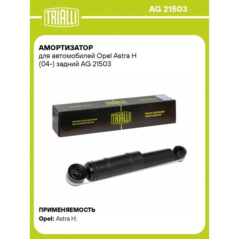 Амортизатор для автомобилей Opel Astra H (04-) задний Описание: Амортизатор AG 21503 бренда TRIALLI – это устройство для гашения колебаний (демпфирования) и поглощения толчков и ударов, действующих на раму. Особенности AG 21503: - Вид – Масляный с газовым подпором низкого давления; - Тип – Двухтрубный, гидравлический; Для крепления к деталям кузова или подвески используются крепления: верхнее Проушина/сайлентблок ; и нижнее Проушина/сайлентблок. Совместим с: OPEL ASTRA.Подбор по VIN-номеру вашего автомобиля - через кнопку 'Задать вопрос'. Специалист проверит применяемость и ответит вам. Преимущества: - Инновационная технология производства; - Контроль качества каждой позиции по чертежам и с помощью 3D модели; - Сальник NOK; - Высокоэффективная система проектирования; - Гарантия до двух лет или 60 000 км пробега; Амортизаторы автомобильные существенно влияют на комфорт вождения, сокращая вибрации от неровностей дороги, что делает поездку более плавной и приятной. Регулярное и своевременное обслуживание амортизаторов помогут продлить их срок службы и обеспечить надёжную работу. Характеристики: Артикул: AG 21503 OEM номера: 0436315, 0436317, 93178640, 93178642, 0436405, 93178641, 436361, 93191129, 93182103, 93182237, 93182239, 436325, 436326 Товарная линейка: BLACK Количество на автомобиль: 2 Вид амортизатора: Масляный с газовым подпором низкого давления Тип верхнего крепления: Проушина/сайлентблок Тип нижнего крепления: Проушина/сайлентблок Диаметр корпуса, мм: 45 Диаметр штока, мм: 12,5 Ход штока, мм: 142 Тип амортизатора: Двухтрубный, гидравлический Ось (сторона установки): Сзади, слева/справа Дополнительная информация: Упаковка изделия может отличаться от представленной на фото Присоединительная длина 2, мм: 413 Присоединительная длина 1, мм: 271 Сопутствующий товар: Амортизаторы: AG 21158; AG 21359 Гарантийный срок: 2 года/60 000 км Подходит для авто: Opel Astra H (04-) Для проверки применяемости отправьте VIN автомобиля через вкладку "Есть вопросы о товаре?" Комплектация: Амортизатор задний - 1 шт Шарнир резинометаллический - 2 шт Гарантия: от 1 года.