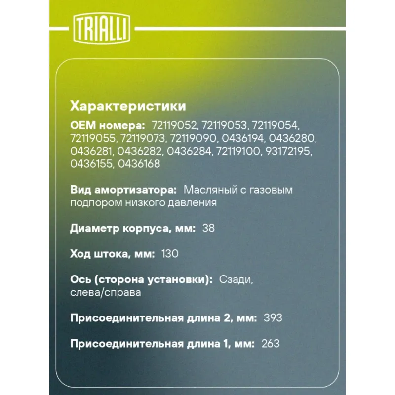 Амортизатор для автомобилей Opel Astra G (98-) седан / хетчбэк задний Описание: Амортизатор AG 21501 бренда TRIALLI – это устройство для гашения колебаний (демпфирования) и поглощения толчков и ударов, действующих на раму. Особенности AG 21501: - Вид – Масляный с газовым подпором низкого давления ; - Тип – Двухтрубный, гидравлический; Для крепления к деталям кузова или подвески используются крепления: верхнее Проушина/сайлентблок ; и нижнее Проушина/сайлентблок. Совместим с: OPEL ASTRA.Подбор по VIN-номеру вашего автомобиля - через кнопку 'Задать вопрос'. Специалист проверит применяемость и ответит вам. Преимущества: - Инновационная технология производства; - Контроль качества каждой позиции по чертежам и с помощью 3D модели; - Сальник NOK; - Высокоэффективная система проектирования; - Гарантия до двух лет или 60 000 км пробега; Амортизаторы автомобильные существенно влияют на комфорт вождения, сокращая вибрации от неровностей дороги, что делает поездку более плавной и приятной. Регулярное и своевременное обслуживание амортизаторов помогут продлить их срок службы и обеспечить надёжную работу. Характеристики: Артикул: AG 21501 OEM номера: 72119052, 72119053, 72119054, 72119055, 72119073, 72119090, 0436194, 0436280, 0436281, 0436282, 0436284, 72119100, 93172195, 0436155, 0436168, 0436170, 0436171 Товарная линейка: BLACK Количество на автомобиль: 2 Вид амортизатора: Масляный с газовым подпором низкого давления Тип верхнего крепления: Проушина/сайлентблок Тип нижнего крепления: Проушина/сайлентблок Диаметр корпуса, мм: 38 Диаметр штока, мм: 12,5 Ход штока, мм: 130 Тип амортизатора: Двухтрубный, гидравлический Ось (сторона установки): Сзади, слева/справа Дополнительная информация: Упаковка изделия может отличаться от представленной на фото Присоединительная длина 2, мм: 393 Присоединительная длина 1, мм: 263 Сопутствующий товар: Амортизаторы: AG 21150; AG 21351 Гарантийный срок: 2 года/60 000 км Подходит для авто: Opel Astra G (98-), Astra G (98-) Для проверки применяемости отправьте VIN автомобиля через вкладку "Есть вопросы о товаре?" Комплектация: Амортизатор задний - 1 шт Шарнир резинометаллический - 2 шт Гарантия: от 1 года.