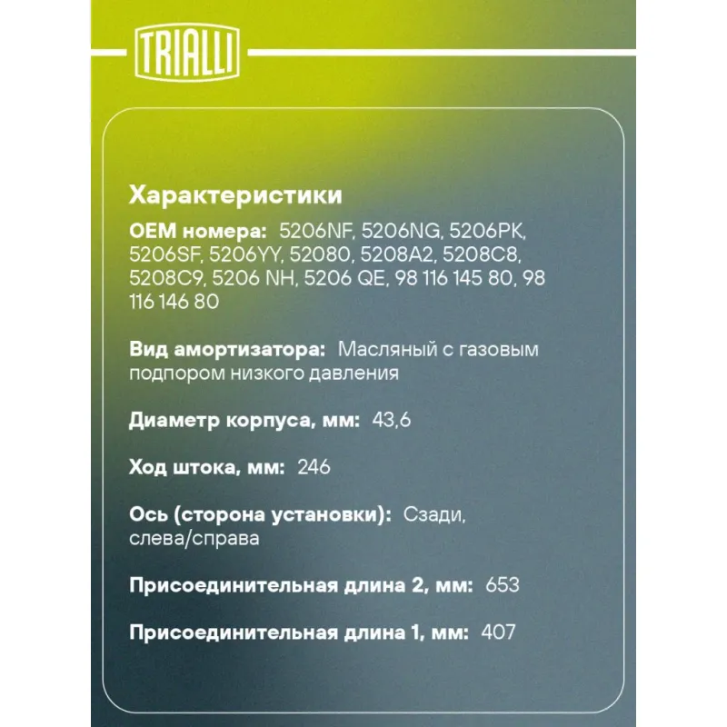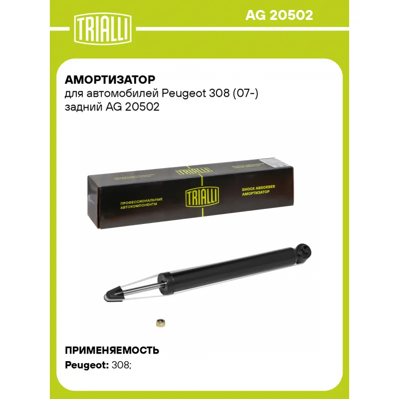 Амортизатор для автомобилей Peugeot 308 (07-) задний Описание: Амортизатор AG 20502 бренда TRIALLI – это устройство для гашения колебаний (демпфирования) и поглощения толчков и ударов, действующих на раму. Особенности AG 20502: - Вид – Масляный с газовым подпором низкого давления; - Тип – Двухтрубный, гидравлический; Для крепления к деталям кузова или подвески используются крепления: верхнее Шток M10x1.5; и нижнее Проушина/сайлентблок. Совместим с: PEUGEOT 308.Подбор по VIN-номеру вашего автомобиля - через кнопку 'Задать вопрос'. Специалист проверит применяемость и ответит вам. Преимущества: - Инновационная технология производства; - Контроль качества каждой позиции по чертежам и с помощью 3D модели; - Сальник NOK; - Высокоэффективная система проектирования; - Гарантия до двух лет или 60 000 км пробега; Амортизаторы автомобильные существенно влияют на комфорт вождения, сокращая вибрации от неровностей дороги, что делает поездку более плавной и приятной. Регулярное и своевременное обслуживание амортизаторов помогут продлить их срок службы и обеспечить надёжную работу. Характеристики: Артикул: AG 20502 OEM номера: 5206NF, 5206NG, 5206PK, 5206SF, 5206YY, 52080, 5208A2, 5208C8, 5208C9, 5206 NH, 5206 QE, 98 116 145 80, 98 116 146 80 Товарная линейка: BLACK Количество на автомобиль: 2 Вид амортизатора: Масляный с газовым подпором низкого давления Тип верхнего крепления: Шток Тип нижнего крепления: Проушина/сайлентблок Диаметр корпуса, мм: 43.6 Диаметр штока, мм: 12,5 Ход штока, мм: 246 Размер резьбы штока: M10x1.5 Тип амортизатора: Двухтрубный, гидравлический Ось (сторона установки): Сзади, слева/справа Дополнительная информация: Упаковка изделия может отличаться от представленной на фото Присоединительная длина 2, мм: 653 Присоединительная длина 1, мм: 407 Сопутствующий товар: Амортизаторы: AG 20152; AG 20353 Гарантийный срок: 2 года/60 000 км Подходит для авто: Peugeot 308 (07-) Для проверки применяемости отправьте VIN автомобиля через вкладку "Есть вопросы о товаре?" Комплектация: Амортизатор задний - 1 шт Гайка крепежная - 1 шт Шарнир резинометаллический - 1 шт Гарантия: от 1 года.
