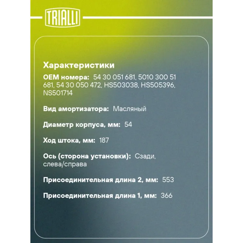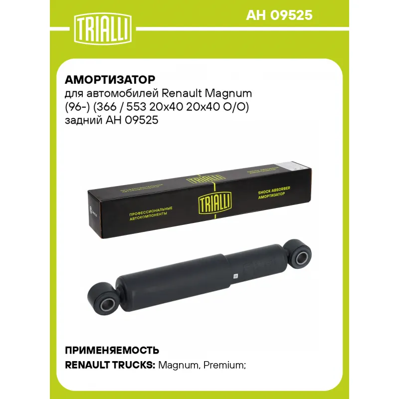 Амортизатор для автомобилей Renault Magnum (96-) (366 / 553 20x40 20x40 O/O) задний Описание: Амортизатор AH 09525 бренда TRIALLI – это устройство для гашения колебаний (демпфирования) и поглощения толчков и ударов, действующих на раму. Особенности AH 09525: - Вид – Масляный; - Тип – Двухтрубный, гидравлический; Для крепления к деталям кузова или подвески используются крепления: верхнее Проушина/сайлентблок ; и нижнее Проушина/сайлентблок. Совместим с: RENAULT TRUCKS MAGNUM, Premium.Подбор по VIN-номеру вашего автомобиля - через кнопку 'Задать вопрос'. Специалист проверит применяемость и ответит вам. Преимущества: - Инновационная технология производства; - Контроль качества каждой позиции по чертежам и с помощью 3D модели; - Сальник NOK; - Высокоэффективная система проектирования; - Гарантия до двух лет или 60 000 км пробега; Амортизаторы автомобильные существенно влияют на комфорт вождения, сокращая вибрации от неровностей дороги, что делает поездку более плавной и приятной. Регулярное и своевременное обслуживание амортизаторов помогут продлить их срок службы и обеспечить надёжную работу. Характеристики: Артикул: AH 09525 OEM номера: 54 30 051 681, 5010 300 51 681, 54 30 050 472, HS503038, HS505396, NS501714 Товарная линейка: BLACK Количество на автомобиль: 2 Вид амортизатора: Масляный Тип верхнего крепления: Проушина/сайлентблок Тип нижнего крепления: Проушина/сайлентблок Диаметр корпуса, мм: 54 Диаметр штока, мм: 18 Ход штока, мм: 187 Тип амортизатора: Двухтрубный, гидравлический Ось (сторона установки): Сзади, слева/справа Дополнительная информация: Упаковка изделия может отличаться от представленной на фото Присоединительная длина 2, мм: 553 Присоединительная длина 1, мм: 366 Гарантийный срок: 2 года/60 000 км Комплектация: Амортизатор задний - 1 шт Гарантия: от 1 года.